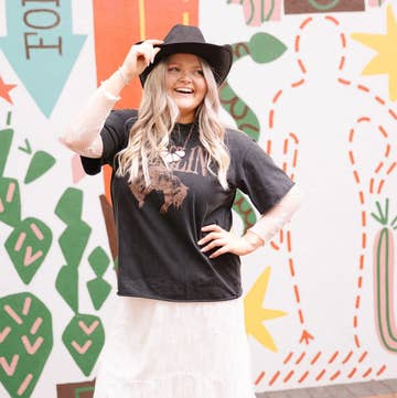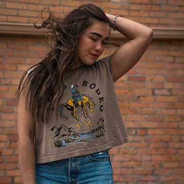 The twin jackrabbits of the desert are a sign of great change, and even greater luck. Strange things happen in the southwest, but that doesn't mean one can't use these omens to their advantage. Womens long sleeve crop tee in Mustard. Drop shoulder seams and a raw bottom hem. Main model wears size X-Large.