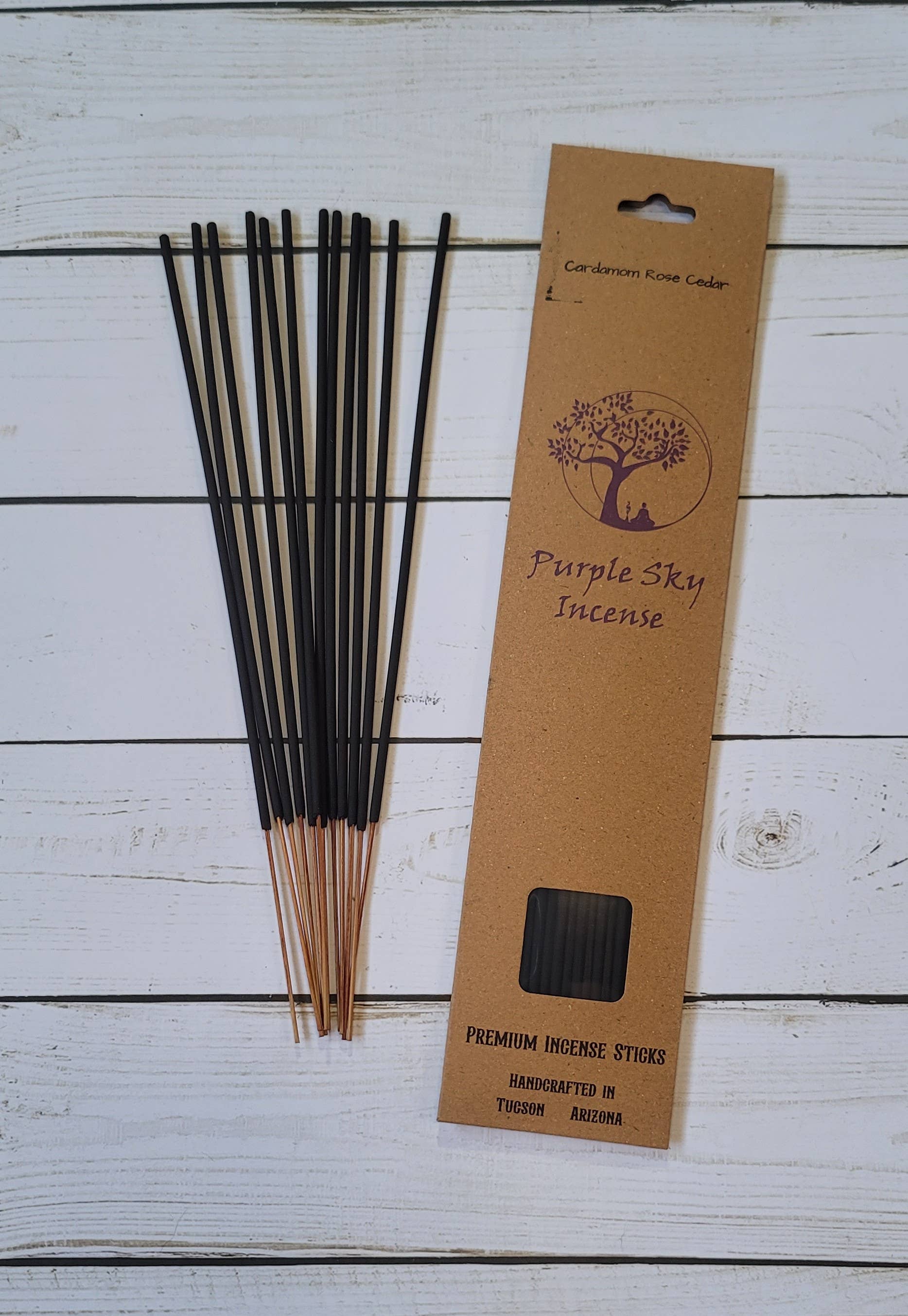 Naked in the Woods - The invigorating scent of sun-warmed figs, Italian bergamot and white tea leaves with notes of jasmine, sweet heliotrope and sandalwood. 12 sticks per pack Use for home, office, rituals, yoga, meditation & more. Handcrafted with clean burning wood powders, essential oils, and phthalate-free fragrance oils in Tucson Arizona. Each stick burns for an hour or more, covering a large area. To Use- Light incense and allow flame to burn for a few seconds before blowing out, leaving the glowing end to smolder and emit a trail of scented smoke. - Always burn in a well-ventilated room on a flame-proof surface. - Never leave burning incense unattended. - Keep out of reach from children & pets. A portion of each sale supports our non-profit Purple Sky Street Dog Alliance.