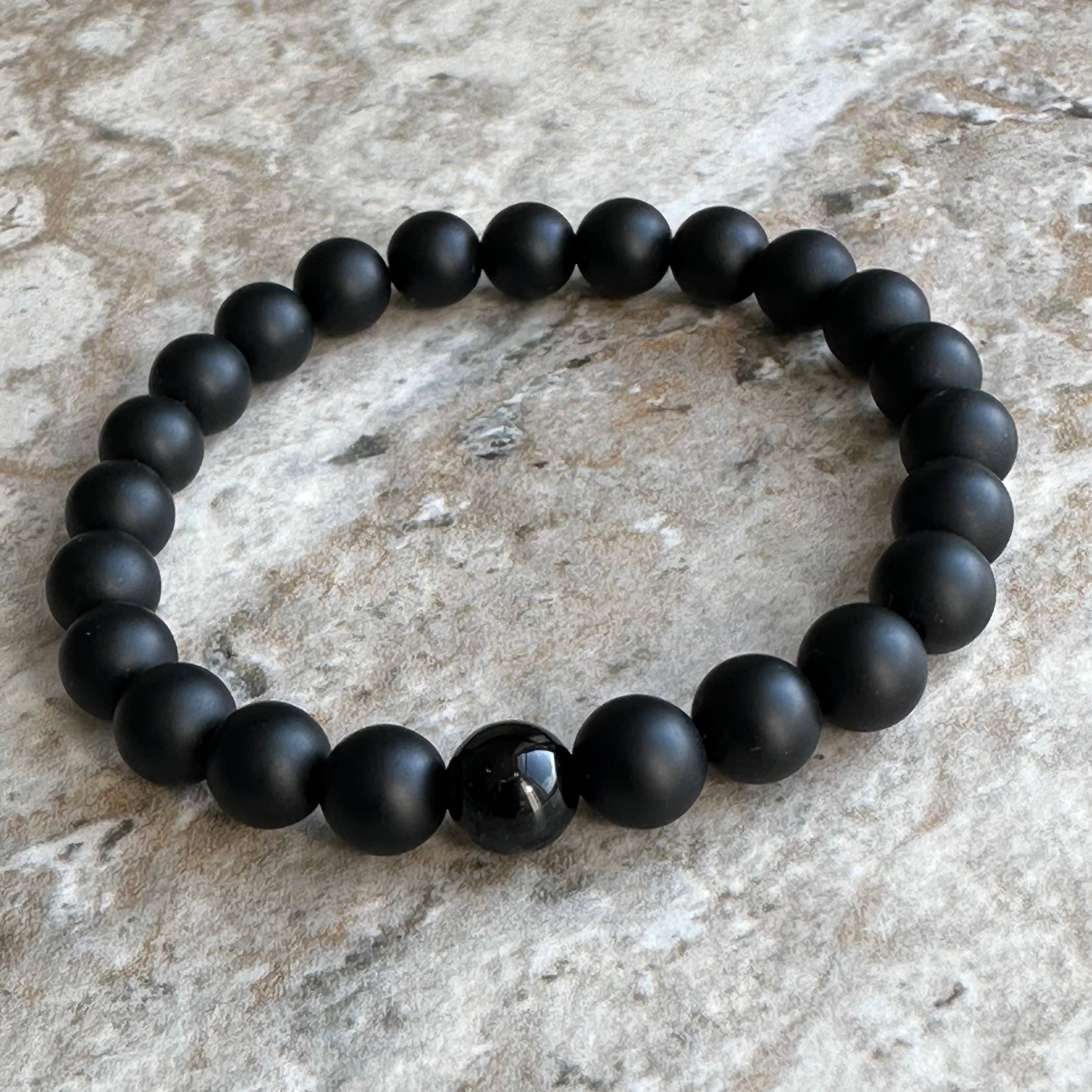 AAA Tiger Eye Focal Bead, Red or Golden with Matte Black Onyx Beads - 8mm (md) 10mm (lrg) or 12mm (xl) beads. DESCRIPTION: - Black Matte Onyx - AAA Red or Golden Tigers Eye Focal - Strong Elastic Cord - BRACELET SIZE: 7.5" KEYNOTES: BLACK ONYX: Self-confidence, Self Control, Decision Making, Regeneration, New Beginning, Intuition, Protection against Outside Negativity TIGERS EYE: Good Luck, Clarity of Vision, Mental Focus, Protection from Evil ♥´¨) ¸.•´ ¸.•*´¨) (¸.•´ ♥--------------------------------------------- PLEASE NOTE: Choking Hazard, Small Parts - NOT for young children. Disclaimer: All gemstone information listed has been collected from various sources. This information is offered for informational purposes only and is not meant to treat medical conditions. Man And Stone does not guarantee the validity of any of these statements.