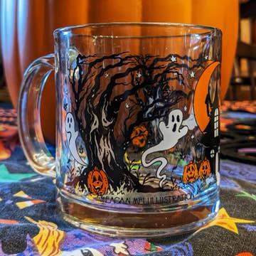 This Halloween mug is inspired by Vintage Halloween pieces from the 80s! This mug has it all: 13oz capacity, no lead content, eco-friendly inks, a wrap-around image that is dishwasher AND microwave safe, all in a lightweight glass package! Modernize your vintage mug collection without compromising on your spooky style!