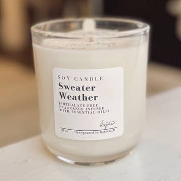 Sweater Weather is one of our best-selling fall candle scents. This lovely fall fragrance starts with top notes of cinnamon and citrus, blended with sweet apple and berries, all over a warm base of pecan and cedar. Mixing earthy outdoor notes with a festive spice blend, it's the perfect Autumn scent. -Natural soy wax candle made from U.S.-grown soybeans -Hand-poured in small batches. -Generously scented with phthalate-free fragrance oils infused with natural essential oils, including cinnamon leaf, cinnamon bark, patchouli, cedarwood, vetiver, guaiacwood, and sandalwood oils. -Reusable glass jar is finished with a silver twist top. -Net wt. 7oz soy candle burns cleanly with a lead-free cotton wick. 50+ hour burn time. Vegan. Paraffin-free. Phthalate-free. Proudly hand-poured in San Jose, CA by a woman-owned business.