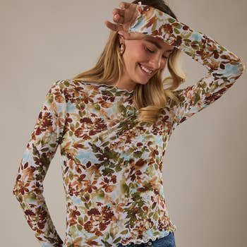EXCLUSIVE FLORAL PRINT RUFFLED MOCK NECK TOP MTP4296