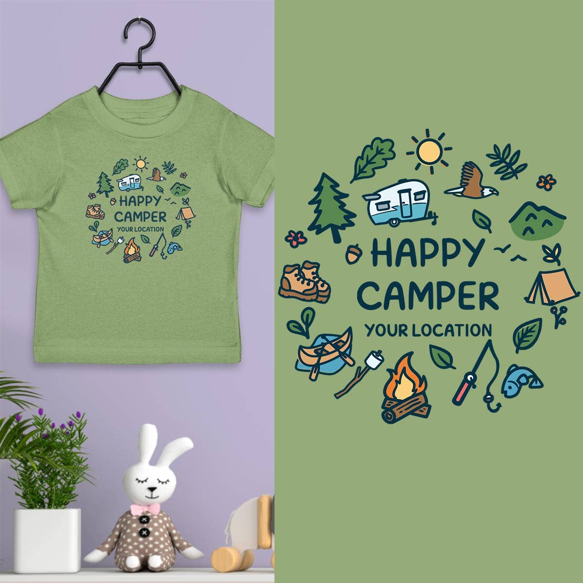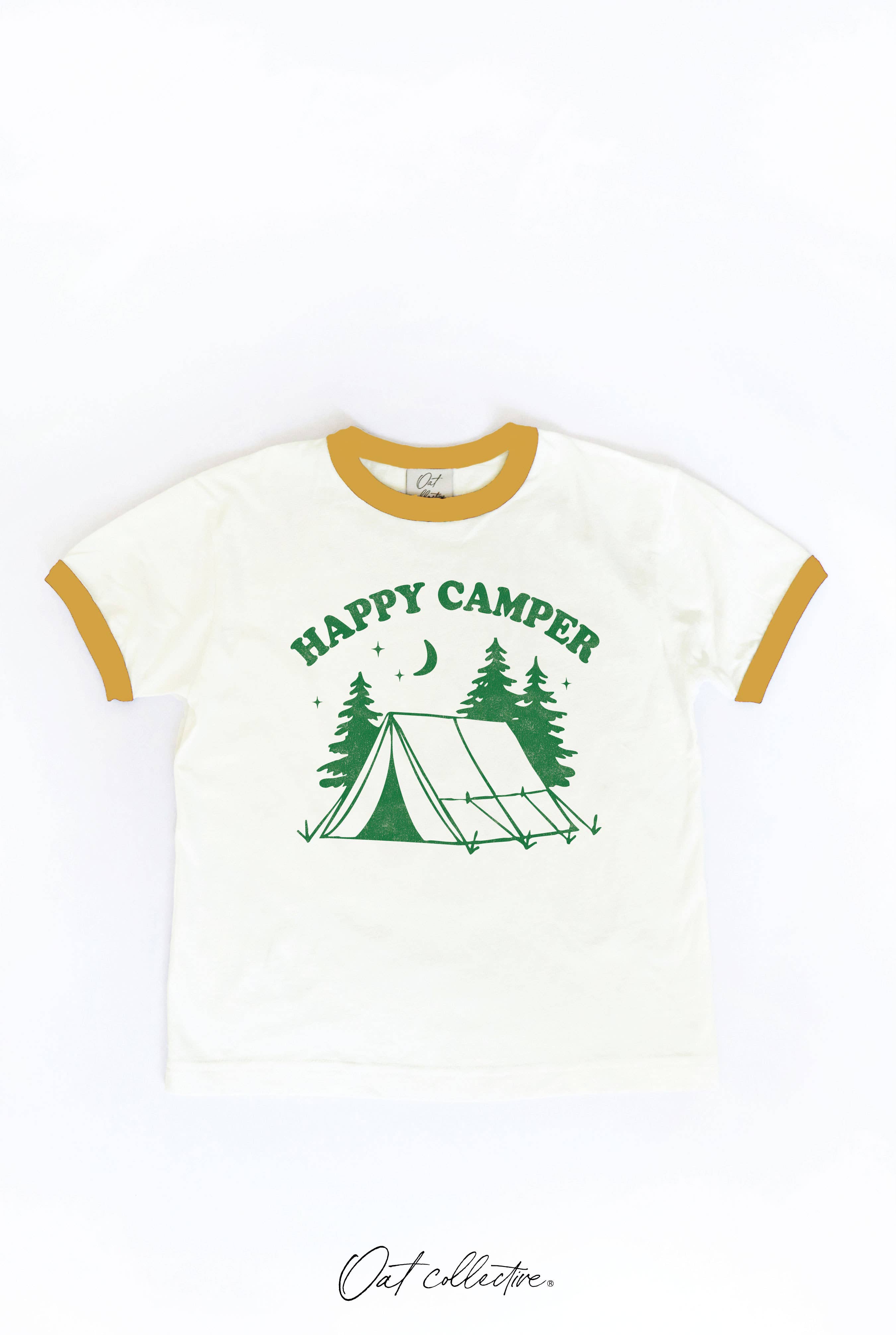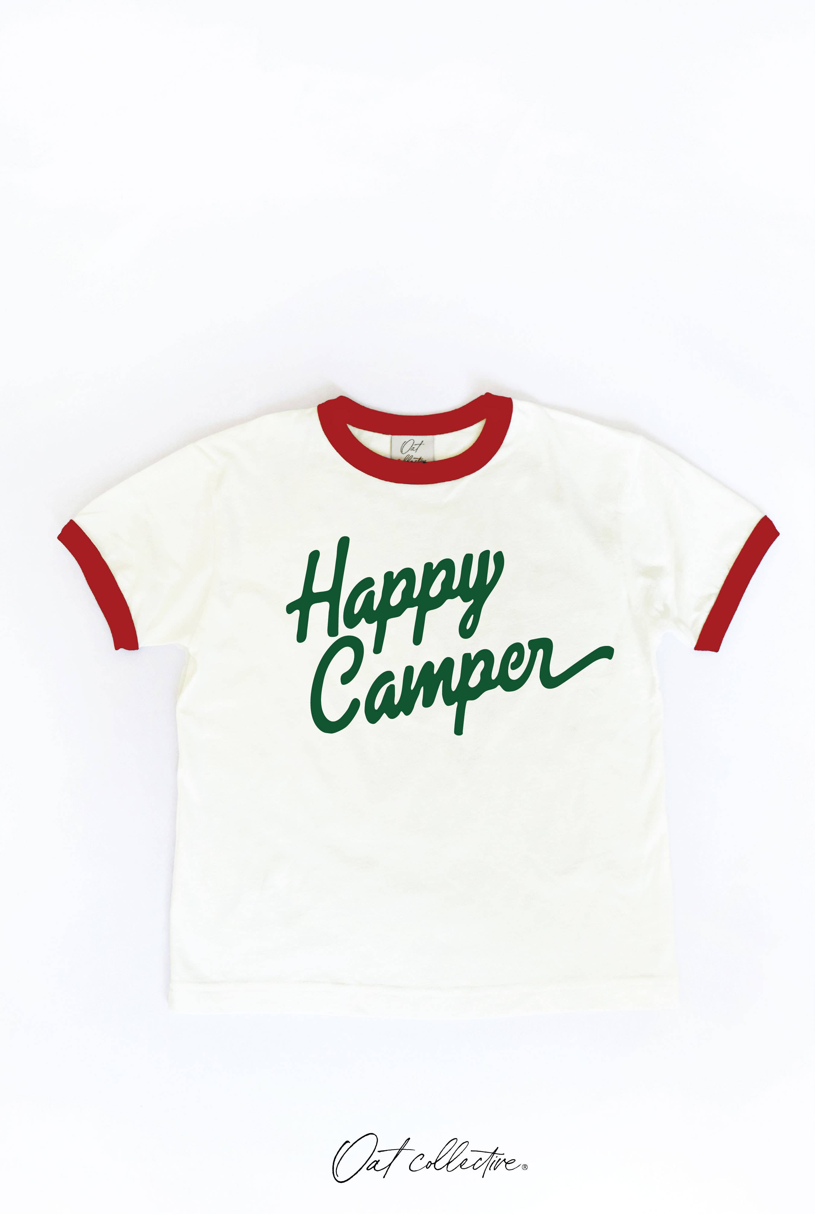 Our happy camper design on a 50% cotton 50% polyester blend next level youth shirt.
