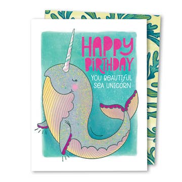 A gentle, graceful humpback whale glides through a whimsical, watery, sun-kissed world. A birthday card that adds beauty to someone's special day! Front: Happy Birthday! Sending you love and sunshine! Inside: Blank Size: A2 (4.25" x 5.5") I chose substantial, luxurious card stocks (100 lb +) with a recycled content ranging from 10-100% for these cards. Cards are printed at a wonderful family-owned print shop here in the San Francisco Bay Area. Each card comes packaged in a plastic sleeve with a 100% recycled brown Kraft envelope. Made in United States of America.