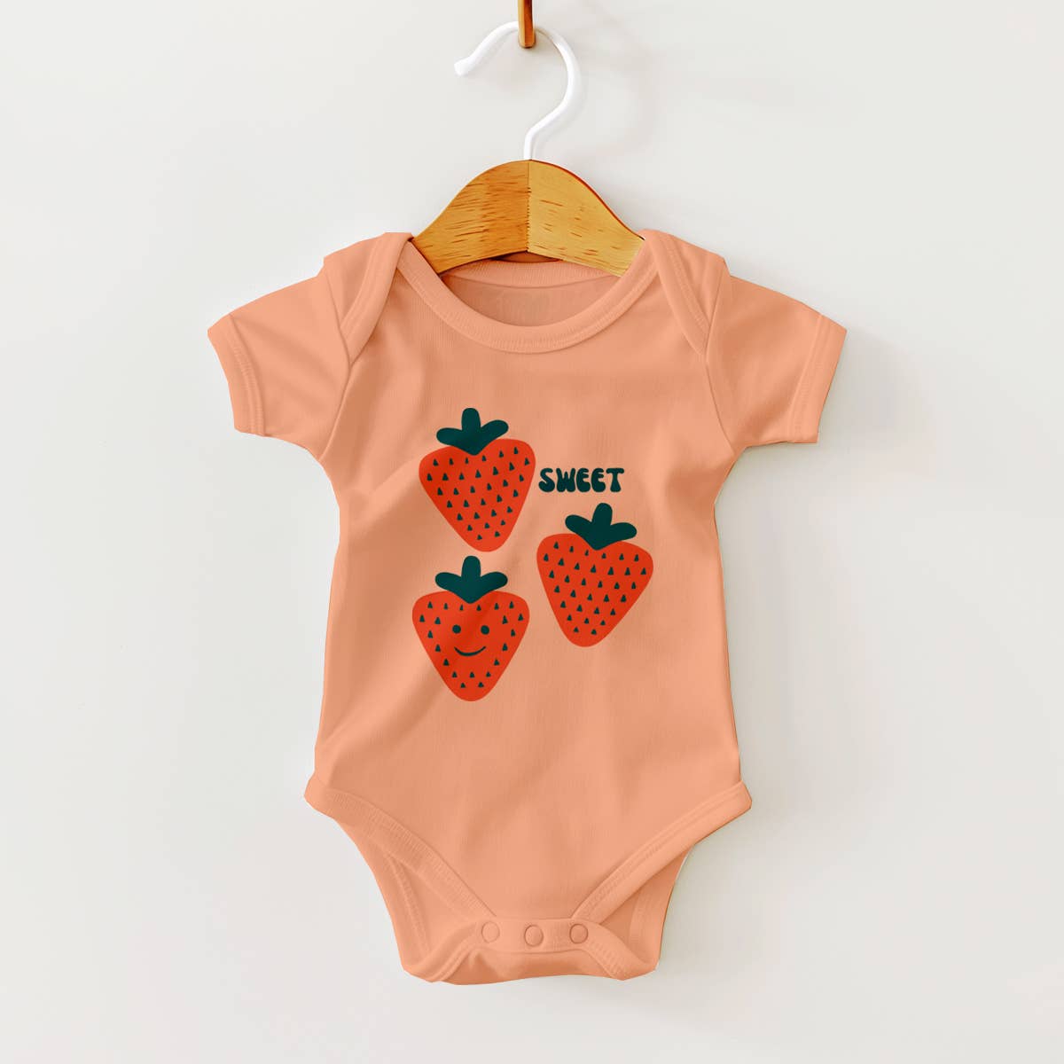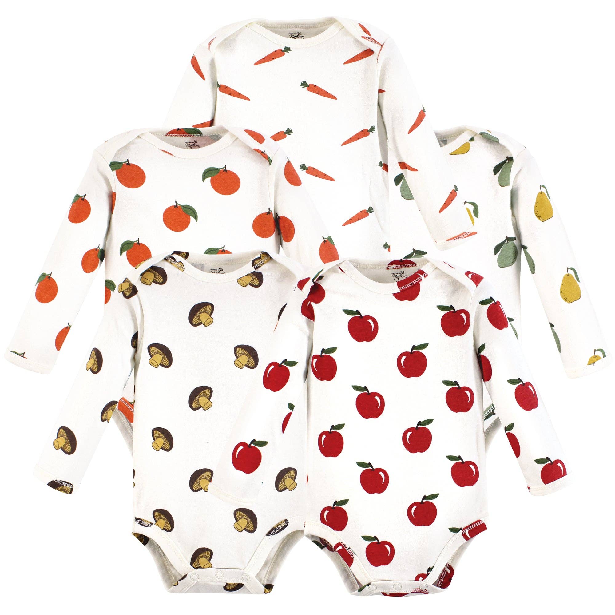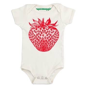 Baby bodysuit in 100% organic cotton (GOTS certified) with fruit print. Short sleeve, wrap-style with cross-chest snaps. * Nickel-free snaps * Azo-free dyes * Ethically produced 1% of sales revenue is donated to environmental non-profits via 1% for the Planet.