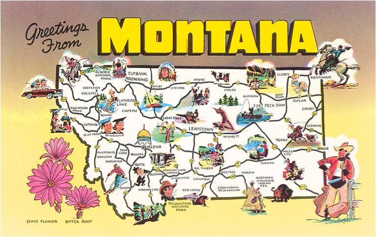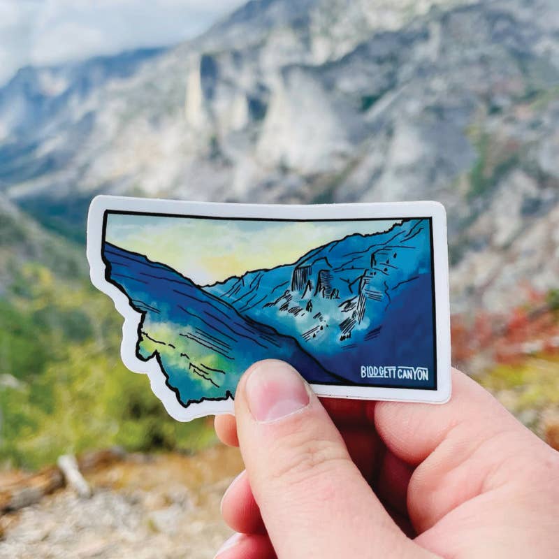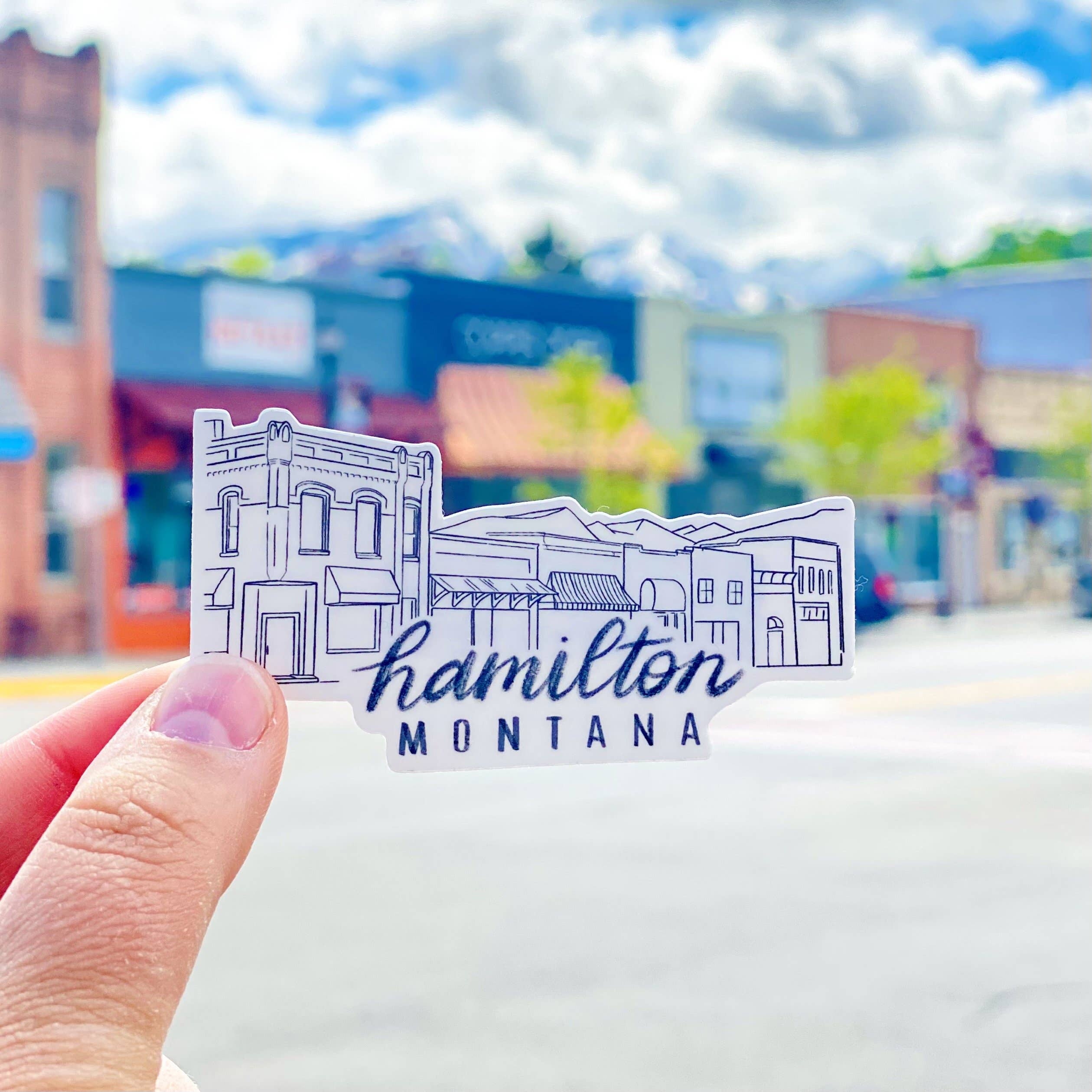 This sticker depicts a scene from Hamilton, Montana. It measures 3" long as is made of a weatherproof vinyl with a matte finish.