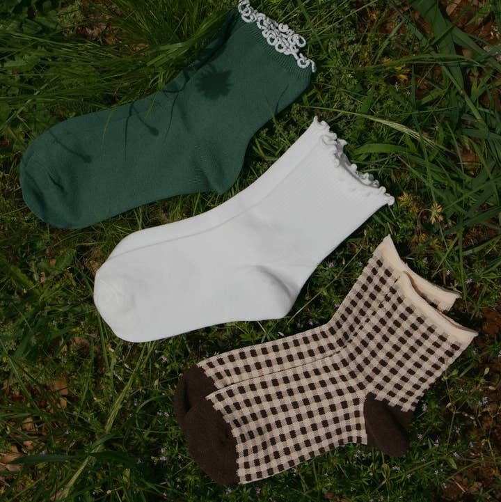 Strawberry Sock Pack (pack of 3 pairs) A little sweet, a little bold — the Strawberry Sock Pack is our freshest trio yet. Inspired by sunny garden days and slow walks down dirt roads, this set includes: * Garden Berry Socks: A soft, speckled blend in natural berry tones — subtle, earthy, and a little wild. * Red Striped Socks: Classic camp style with a bold, vintage stripe. A nod to trailhead mornings and cooler hikes. * Red Ruffle Socks: Playful and retro with a soft ruffle top — the kind of sock that turns heads on and off the path. Made with 65% cotton, 30% polyester, and 5% spandex. One size fits all. All shoe sizes below fit comfortably in these socks: US (Men) US (Women) UK EU Japan (cm) Australia (Men) 6-12 7.5-13.5 5.5-11.5 39-46 24-30 5.5-11.5