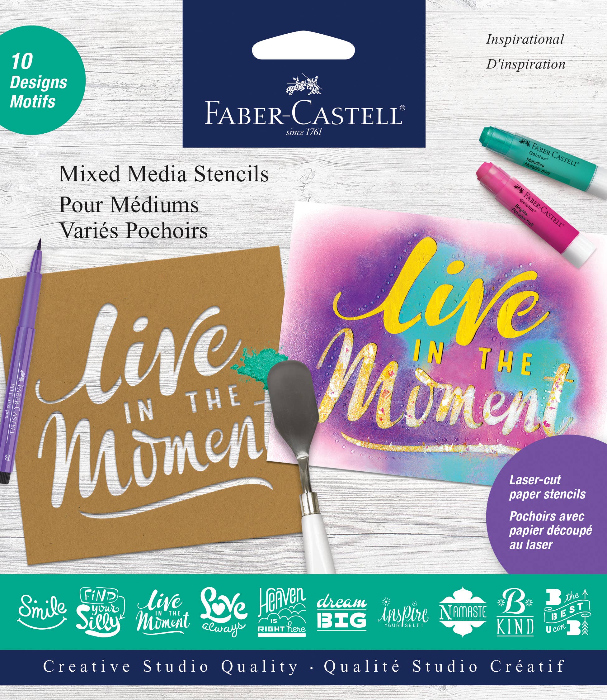 Create beautiful DIY inspirational paper crafts with these reusable paper stencils. Designer patterns are perfect for embellishing. Use gelatos to add unique designs to mixed media projects or use them as an element in mixed media work. The paper stencils are durable. It is suggested to coat them with a glaze medium to extend their use. For clean detail, coat the stencil with repositionable spray adhesive prior to use.