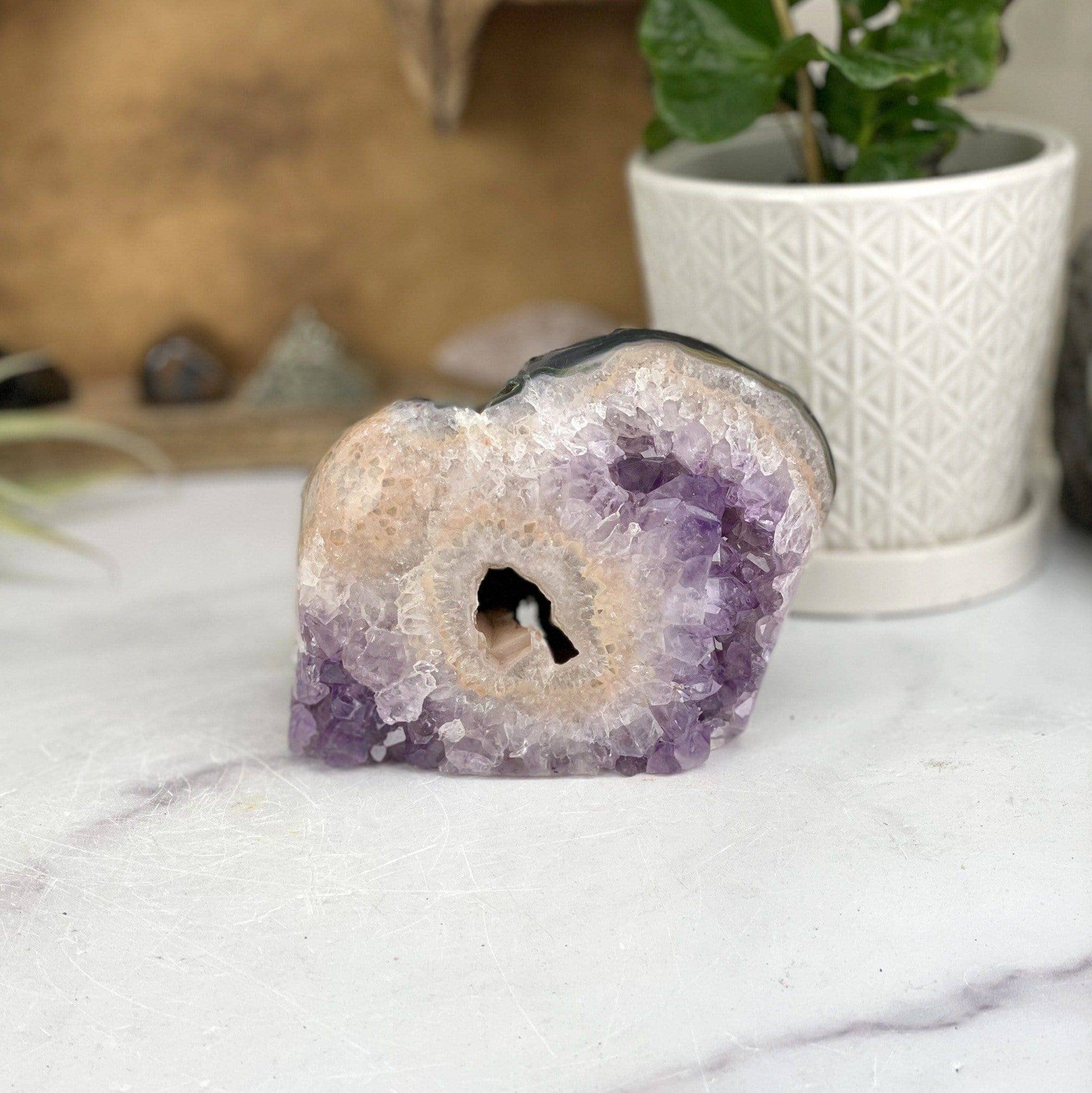 MB-HTAMS Small Amethyst Heart on Stand. Size, color, and shape vary. Sizes range from 3.5 to 4.5 inches. Made in Brazil Min. 1 *PRODUCT WEIGHT LISTED IS AN AVERAGE WEIGHT, EACH PIECE IS INDIVIDUAL AND WEIGHT WILL VARY* Transform your space into a sanctuary of serenity with our exquisite Small Amethyst Heart Geode on Stand, available at wholesale prices. Crafted from genuine amethyst, renowned for its spiritual properties, this mesmerizing geode radiates calming energy, inviting tranquility and balance into any environment. Its heart-shaped formation symbolizes love and harmony, while the crystal's natural beauty adds a touch of elegance to any decor. Perfect for spiritual practices, meditation spaces, or simply as a stunning accent piece, our Amethyst Heart Geode on Stand brings the essence of the earth's energy into your home or workspace.