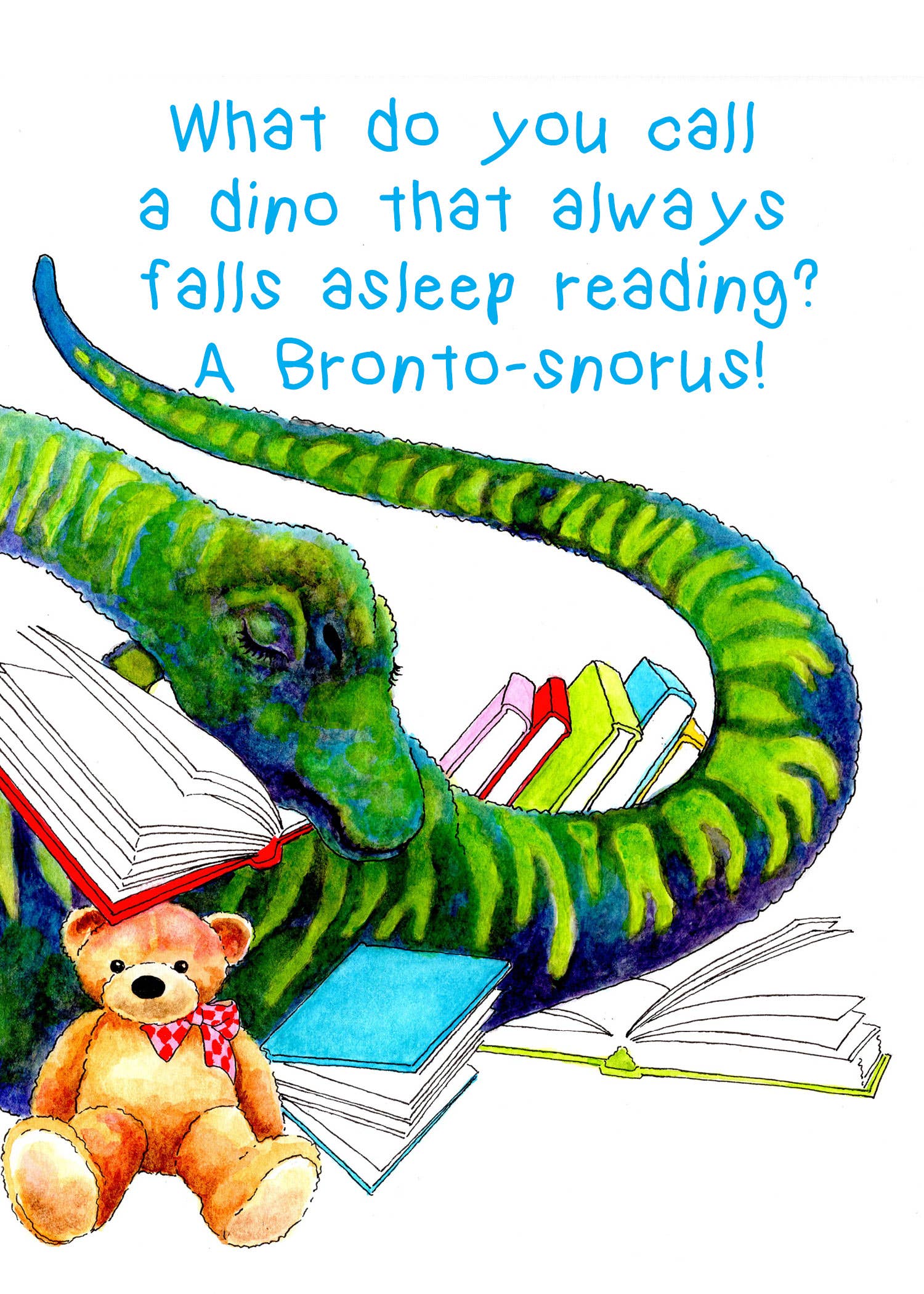 Reading is roar-some! And some dinos like to devour books any time of day. This T-Rex loves them all. Fun dino jokes on the back. Original art notecards for dino-loving loving kids with some reading encouragement. 5x7 with colored A7 envelope, blank inside - you don’t need an occasion to make them smile.