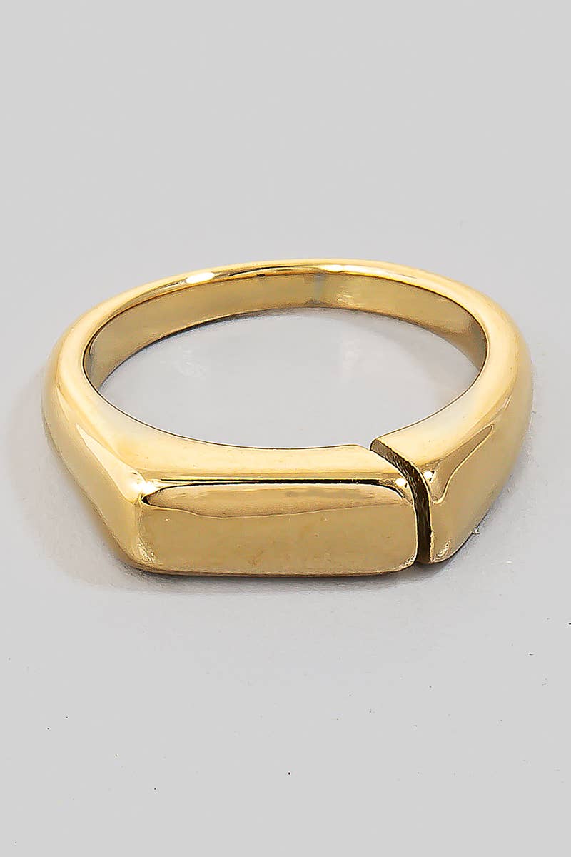 This mini signet dainty ring is perfect for mixing and matching with other rings. Create your own stacking with our dainty rings. Size: 5,6,7,8,9 Closed band. Weight: Lightweight. Material: Gold plated over Stainless Steel. Color: Gold. Hypoallergenic Tarnish Resistant
