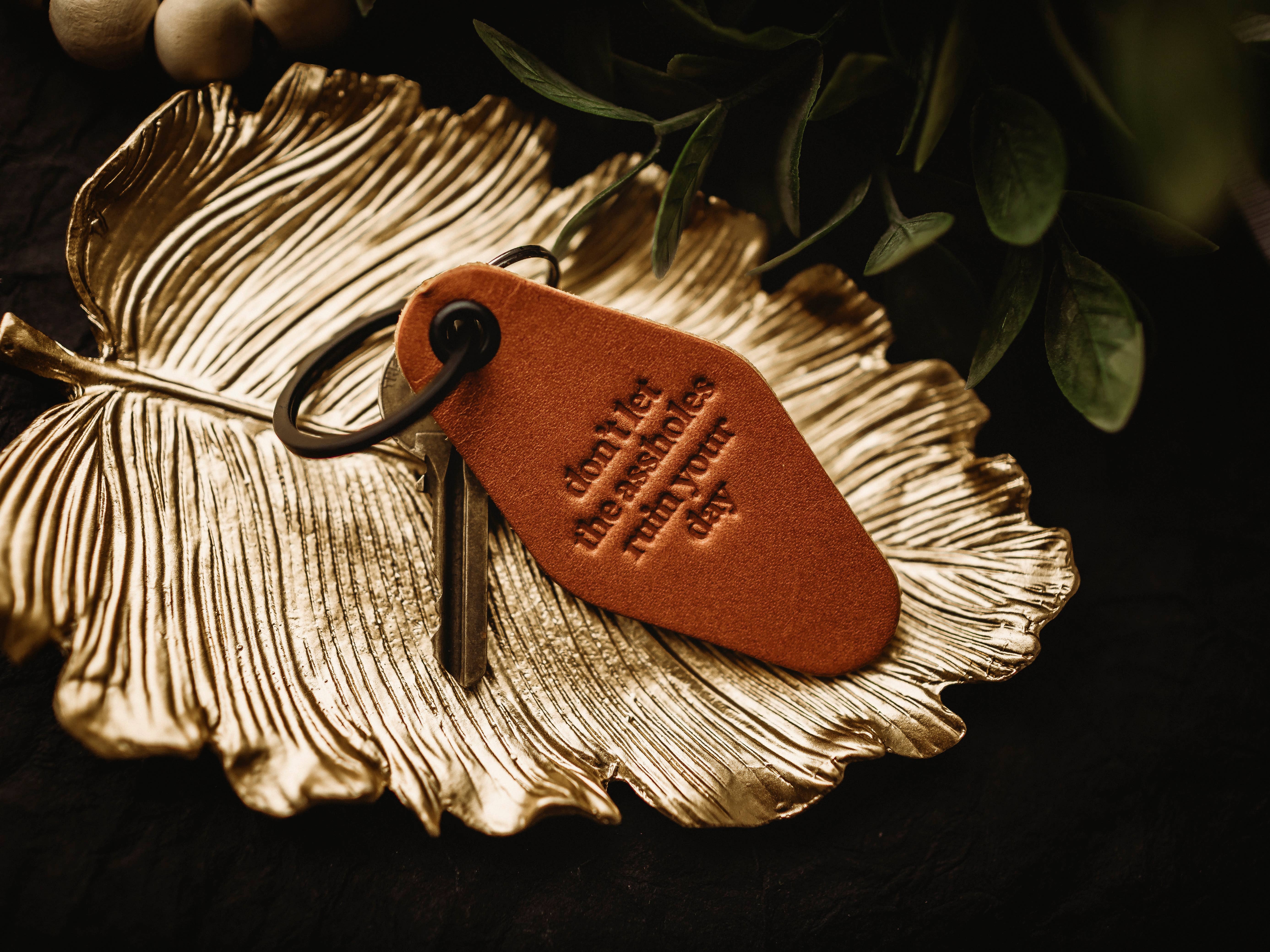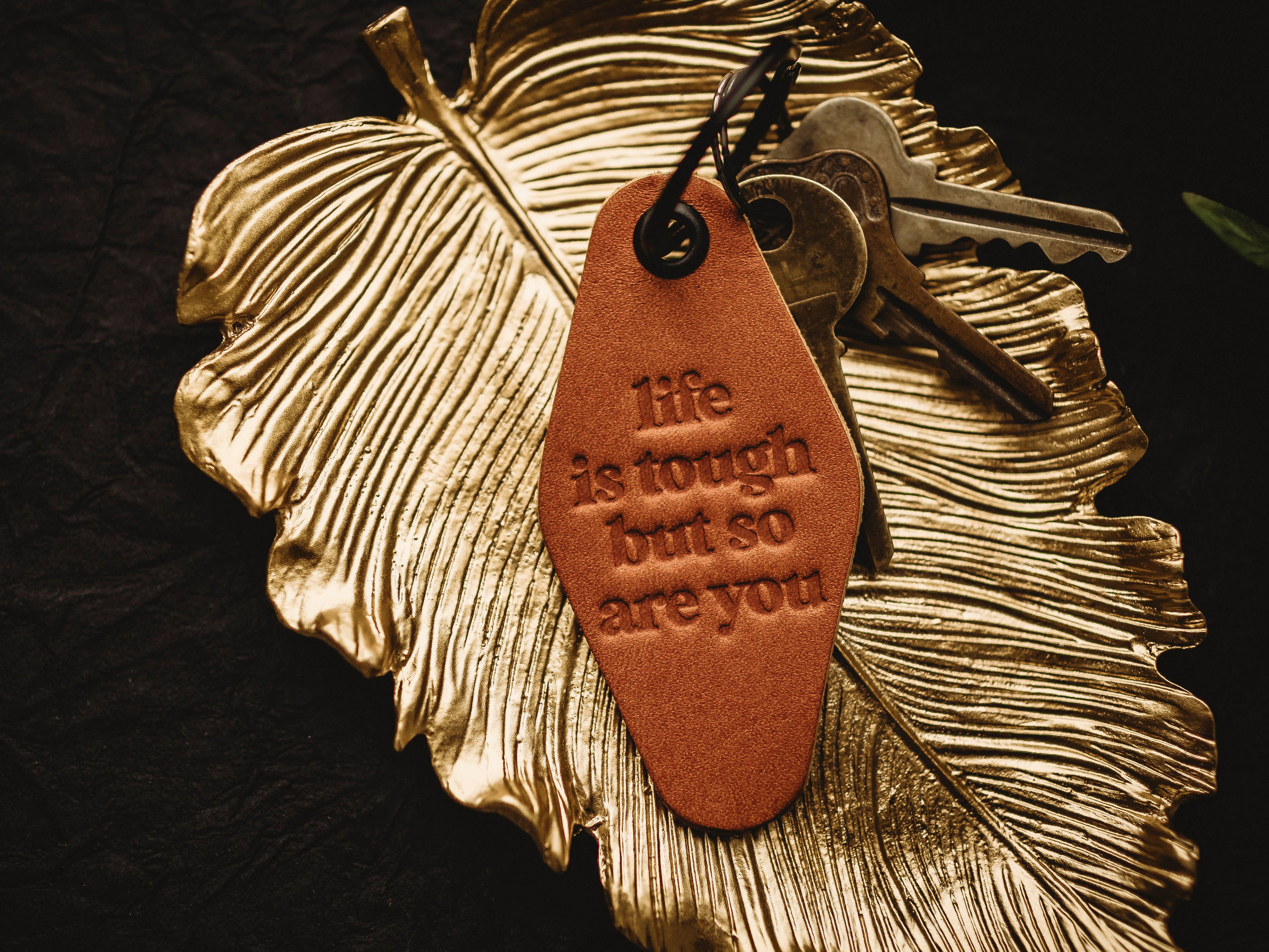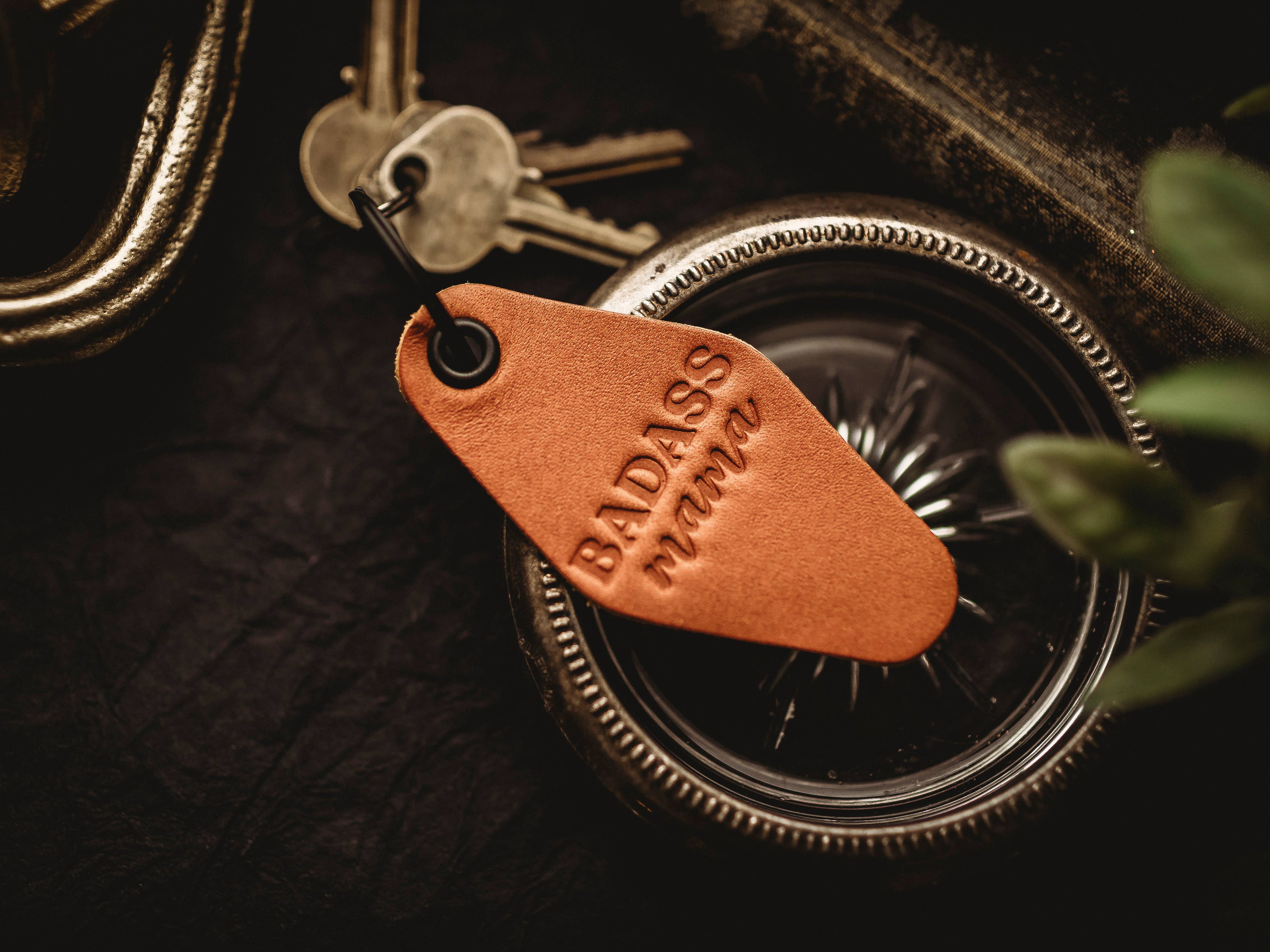 Genuine Leather Motel Keychain Stamped With "Manifest That Shit" DETAILS: - Made from genuine leather - Camel brown color - Measures approximately 3 1/4" x 1 5/8" - Black hardware (keyring & eyelet) - Lightweight, easy to carry, and will age well over time PRODUCTION: - Each key fob is made by hand with genuine leather so there may be slight variations from piece to piece, making it truly unique. - Backside of keychains are unfinished as shown in photos - Handcrafted with care in our home studio. - For rush orders, please message us first!