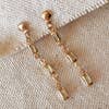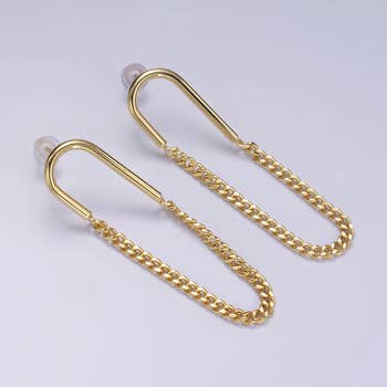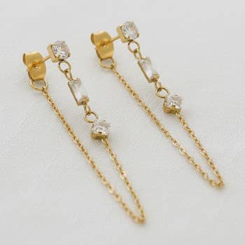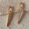 Two zirconia tied by a roll link chain gives you an elegant punk style to your ear stacking. You must have two piercings in each ear to wear these earrings. Sold by the pair. * Metal: 18k gold-filled * Size: 3mm CZ Stud with 4 inches-long chain * High-quality cubic zirconia AAAAA * Hypoallergenic and water-resistant * Handcrafted in Brazil
