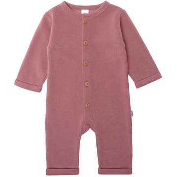 The high-quality rib-knit jumpsuit is slightly elastic and very comfortable on the skin, perfect for feeling good. The rose-colored jumpsuit can be closed with the five beautiful wood-look buttons on the front. The sleeves and legs have a turned-up hem, and the round neckline is finished to a high standard. The footless jumpsuit is not only super casual but also perfect for babies and toddlers thanks to the soft quality that ensures comfortable wear. The beautiful rosewood color is an absolute eye-catcher! Made of 80% cotton and 20% polyester Washable at 40°C