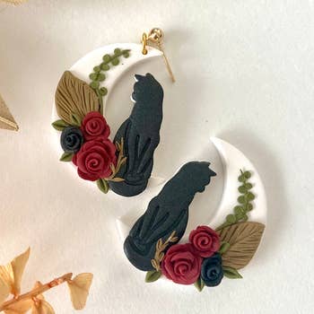 Handcrafted polymer clay earrings with stainless steel studs. Black spiders adorned with maroon flowers and silver leaves.