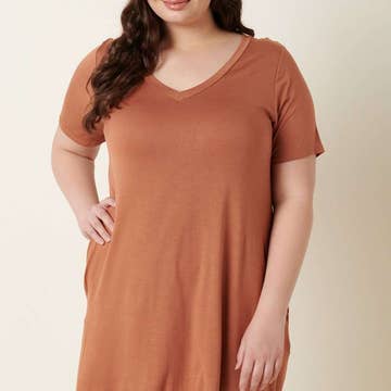 Short-sleeved v-neck shirt tail dress. Midi length with side slits. Back yoke panel shirring.