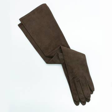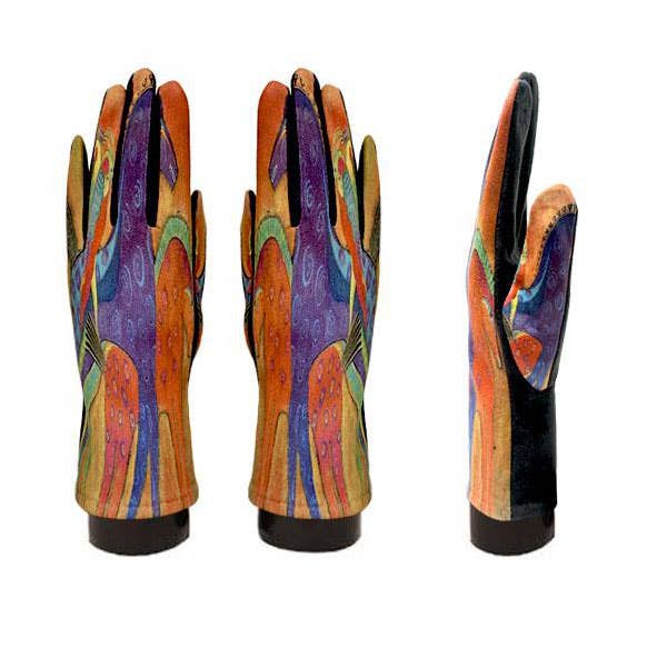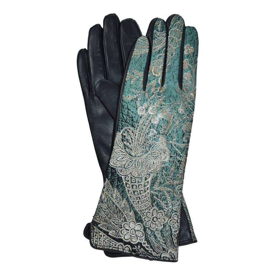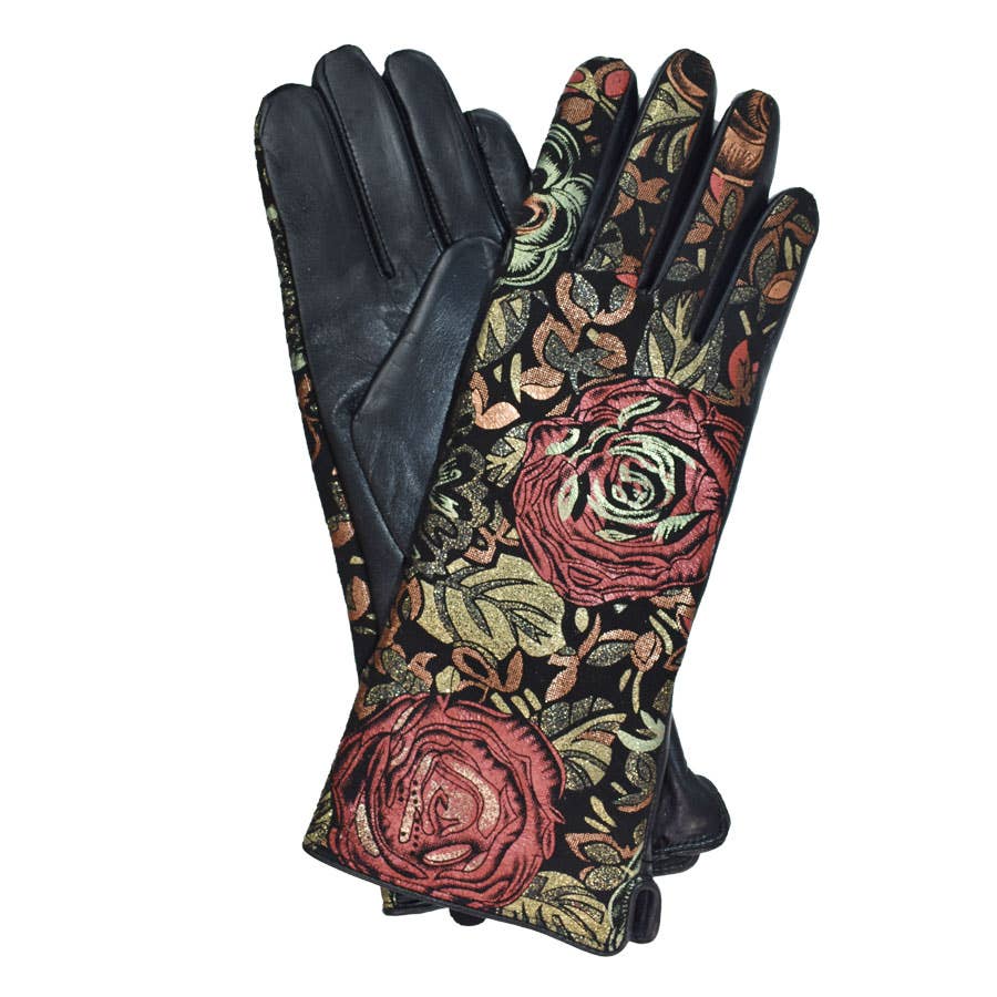 Stand out this season with these repetitive floral print, genuine leather gloves! Featuring ruched detail at the cuff and a velvet liner, these extra long, soft leather gloves will elevate your everyday style. The soft metallic tones pop against the black background, making this an instant winter classic. Pattern variation per piece does occur and is part of the unique charm of this design. Size: 8.5, Medium Fabric: 100% Sheepskin Leather Care: Spot clean only Length: 11.5"