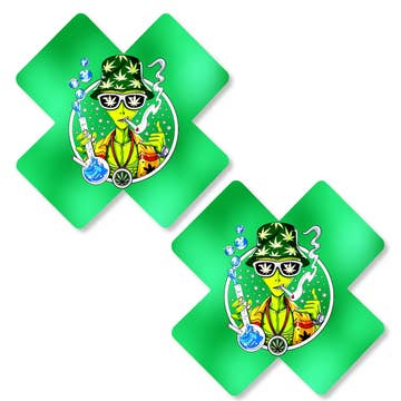 Take your style out of this world with our Alien Smoking Pasties! These fun X-shaped nipple covers come in a variety of colors and feature a playful design of an alien smoking. Perfect for adding a touch of the extraterrestrial and rebellious flair to your outfit, these pasties are ideal for parties, festivals, themed events, or any occasion where you want to make a bold and quirky statement. The size is 2.75 inches. Crafted from high-quality materials, our Alien Smoking Pasties are easy to apply and provide a comfortable, secure fit. Whether you're attending a themed party, music festival, or just looking to add some cosmic style to your look, these pasties are the perfect accessory. Have a Nip-Tastic time! Niptees offers custom pasties to fit any style or theme. Contact us for custom orders and create a look that’s uniquely yours! Nip-Tees has products for various occasions: vacation, bridal, beach, lingerie, tanning, and party! Be sure to check them out! #alien #pasties #420
