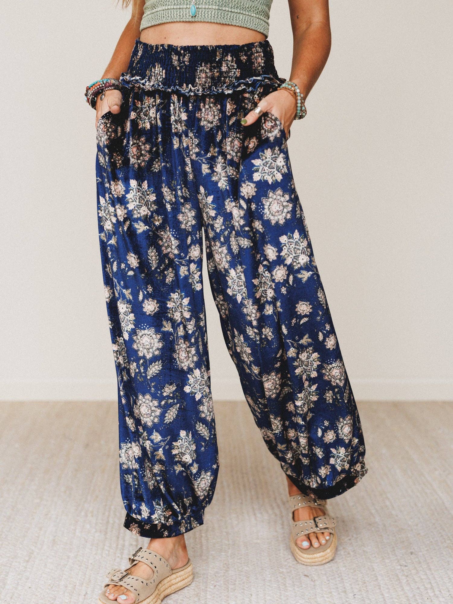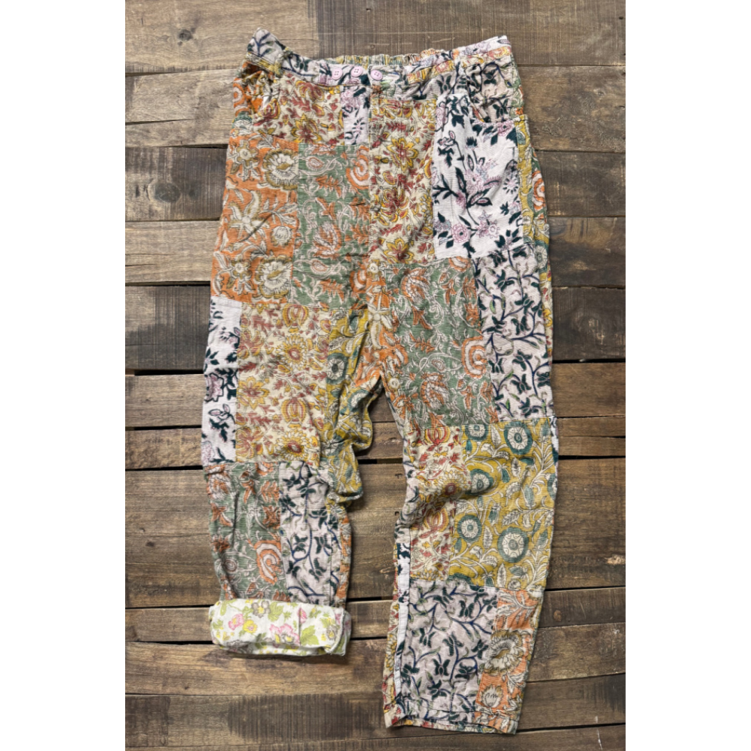 * Full elastic pant with front pockets and tulip detail at bottom * XS Waist (stretched) 36.5", Hip (8" below waist) 41.5", Length 35.5" * S Waist (stretched) 39", Hip (8" below waist) 44", Length 35.75" * M Waist (stretched) 41.5", Hip (8" below waist) 46.5", Length 36" * L Waist (stretched) 44", Hip (8" below waist) 49", Length 36.25" * XL Waist (stretched) 46.5", Hip (8" below waist) 51.5", Length 36.5" * Inseam for all sizes is 26" * 100% cotton