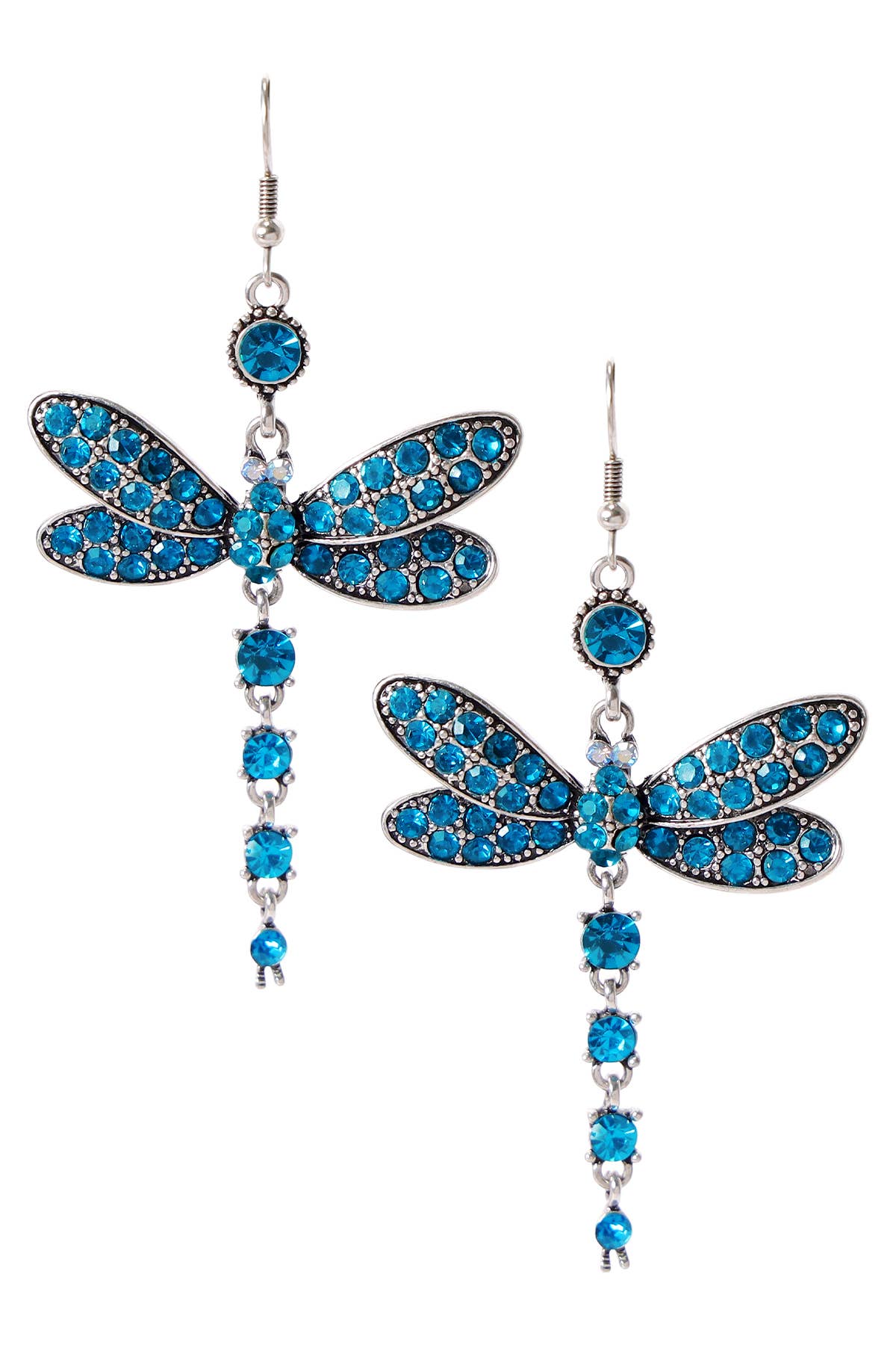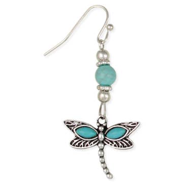 Multi-colored Austrian crystal dragonfly earrings. Made in USA. Plated in antique sterling silver. L: 1".