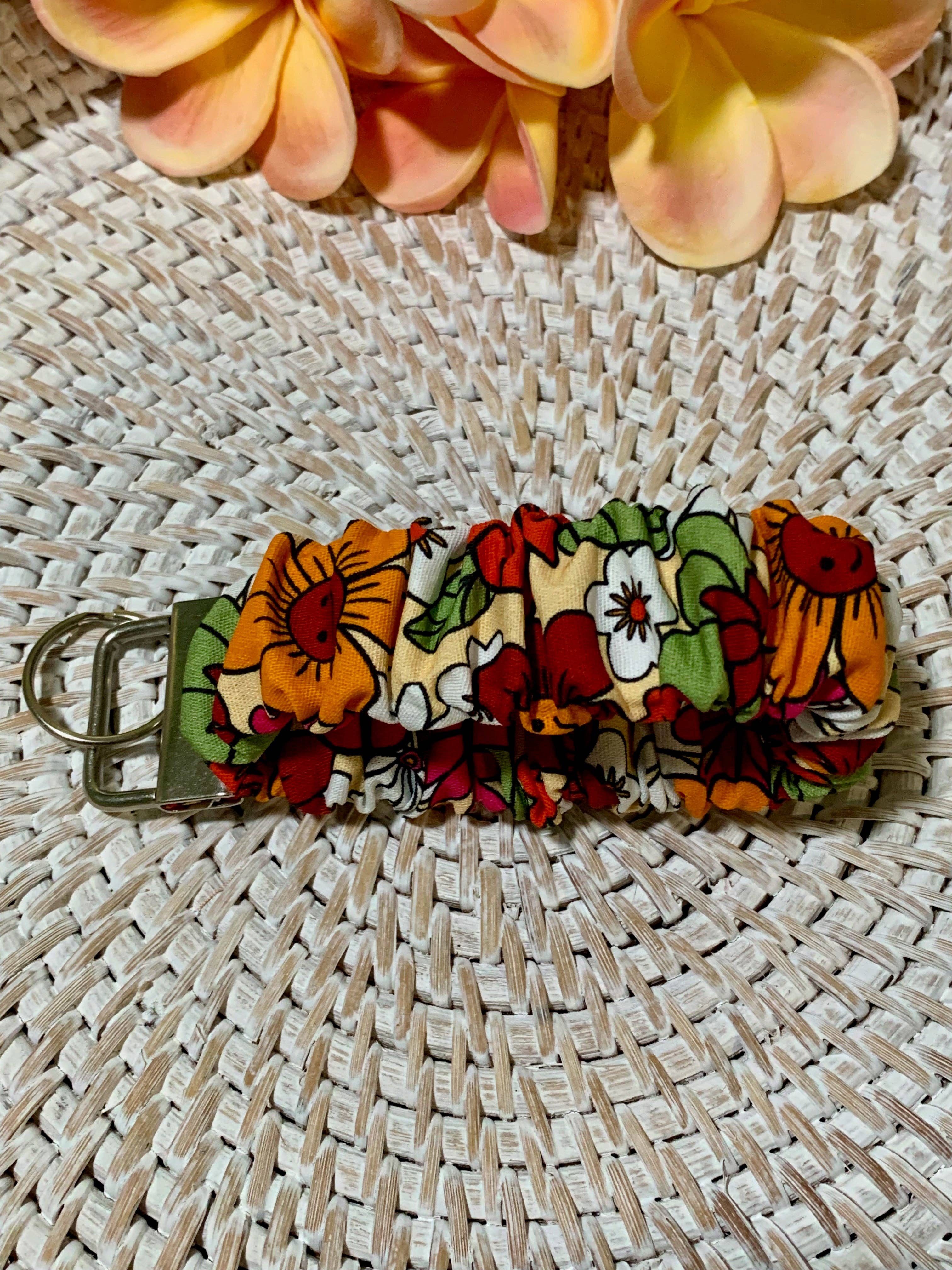 A stylish, convenient way to keep keys organized! Wristlet style - keys can be held or slipped over wrist. Made with reinforced designer cotton fabric. This keychain is a beautiful designer fabric with a red floral print. Hardware is black. Keychain measures 6” (including metal hardware), with a 1” ring. *Exact patterns in fabric will vary.