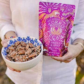 Roasted nuts in a peppery blend of spices and real maple syrup. Golden turmeric and black pepper work together to create a savory snack with heat, depth and a whole lot of nutrients in every single bite. Our mixed nuts also make excellent corporate gifts and wedding favors and are handmade by people of all abilities. Vegan, Paleo, Gluten-free, Fair Trade, Non-GMO, Organic, Soy-free, Dairy-free, Sustainably Sourced, Handcrafted. PAIRING IDEAS: One of the first forms of medicine, turmeric also adds a dynamic and earthy flavor that makes it a well matched addition to savory dishes like curries and soups. Or, as a protein rich snack to bookend a yoga class or cardio workout. INGREDIENTS: Cashews*, pecans**, walnuts*, maple syrup**, turmeric*, spices*, sesame seeds*, salt, sea salt. Contains Cashews, Pecans, Walnuts, Sesame.  *Organic, **Non-GMO PACKAGE DIMENSIONS : 5 oz—5.75”w x 7.5”h x 2”