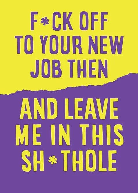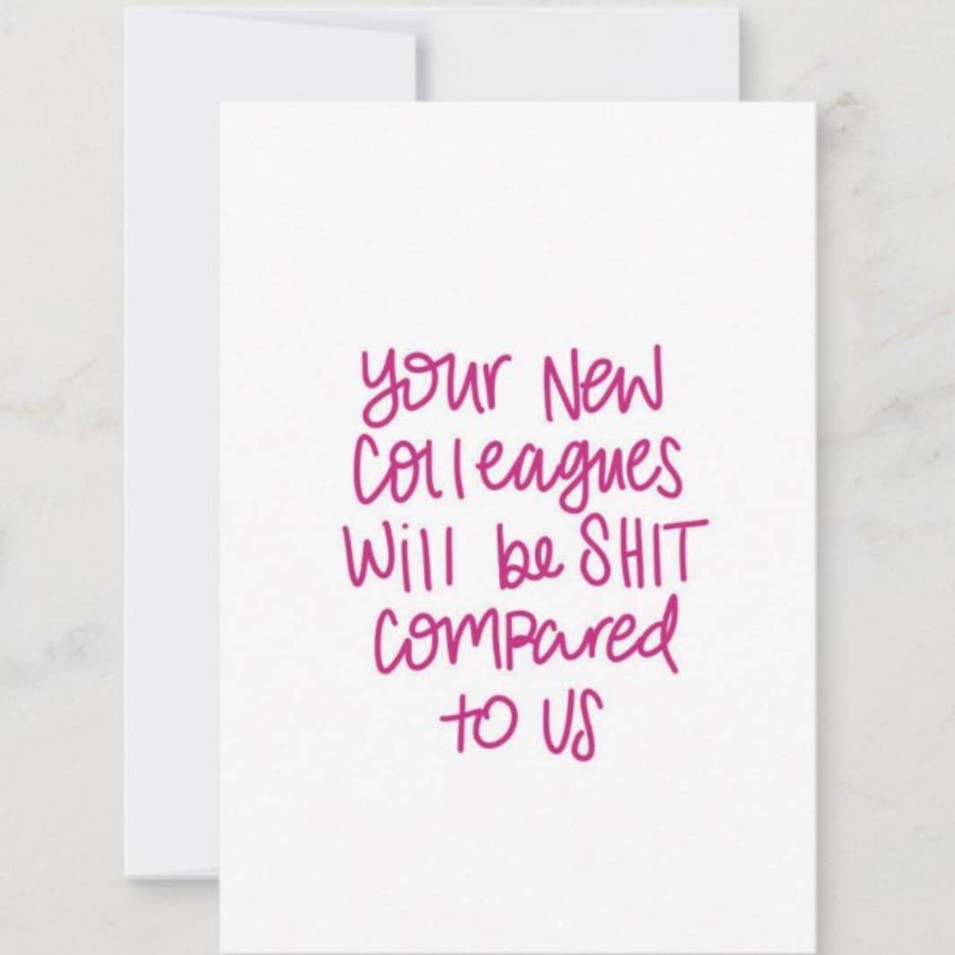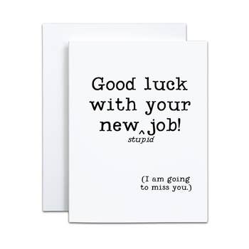 Introduce a splash of humor to your product offerings with our "Good Luck at Your Stupid New Job" card, a snarky and amusing farewell option perfect for coworkers and bosses. Ideal for wholesale, this card is sure to be a hit among customers looking for a unique and lighthearted way to bid farewell to departing colleagues. - Front: Good luck at your stupid new job with your stupid new little work friends who talk about stupid shit and invite you to do stupid new things. - Inside: blank - A2 card size (4.25in x 5.5in) - 100 lb Lynx cover uncoated cardstock - Includes extra kraft envelope - Card + envelope wrapped in an cello sleeve