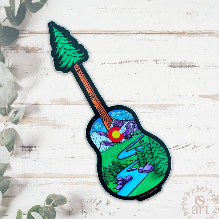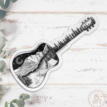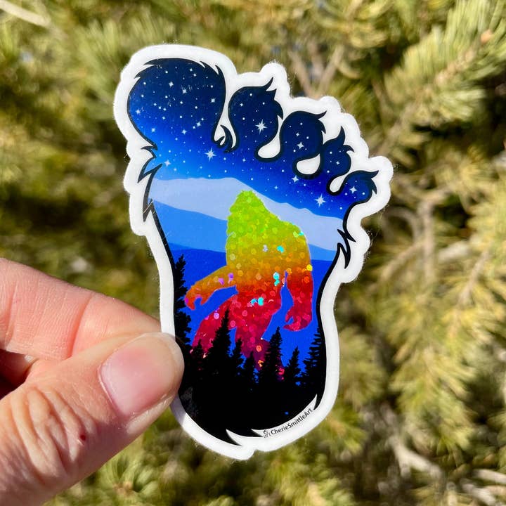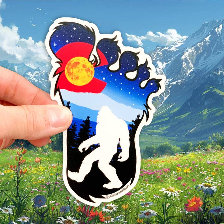 Storyteller is a vibrant illustration shows a chill Bigfoot riding a moose through a mountain stream, flashing a peace sign and rocking sunglasses. Framed by colorful trees and set beneath a starry twilight sky, the scene blends snowy peaks, flowing water, and bold foliage into a playful mix of wilderness and myth. PRODUCT INFORMATION: Sticker Sizes: * Medium: 2.48"x3" * Large: 3.28"x4" This image is offered as a Vinyl Sticker that is dishwasher safe, weatherproof, and scratch-resistant, it will not crack, fade, or peel for years to come. On Hand in Colorado