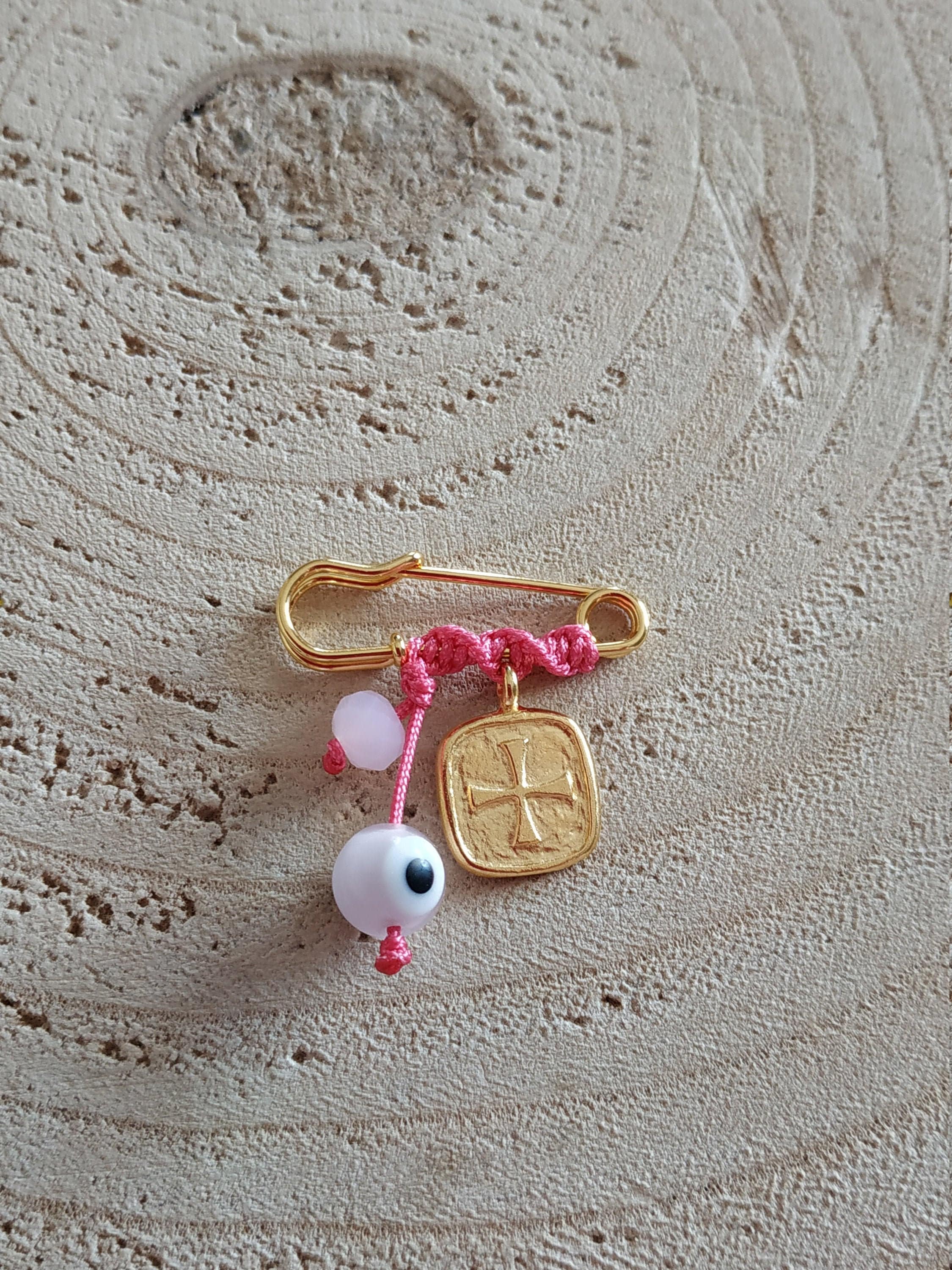 This is a wonderful present for newborn babies, boys & girls. It's a pin 2.7cm wide and 2.3cm long with ivory satin cord, twisted on the pin & a colorful rainbow charm, hand painted with enamel colors. Excellent choice for a present for a party, for baby shower, for new born. It may used as a protection decorative pin on the stroller or pillow. It comes without the cushion, as it is for display purposes only.