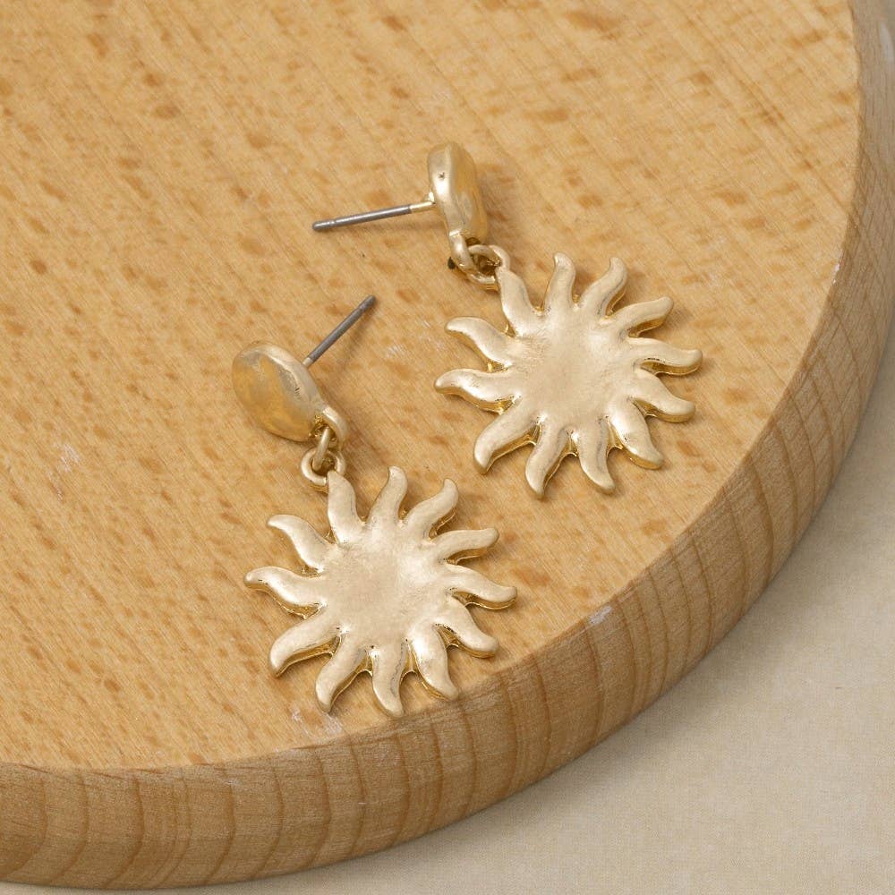 RHINESTONE SUN EARRINGS -boho chic showstoppers -cubic zirconia sun charms with beaming gold tassels ANTI-TARNISH GOLD LAYERED -Our 18k gold layers are wonderfully thick. -Durable for long term wear. SAFE FOR SENSITIVE SKIN -Free of nickel, lead, & metals that irritate the skin -Will not turn skin green -Very lightweight & comfortable on the ears SIZE -Length of earring: ~2.5" SOLD IN CASES OF 2 PAIRS You will receive 2 pairs of earrings per case. PACKAGING -Arrives on a branded SALT card. -Easy to display in your shop!