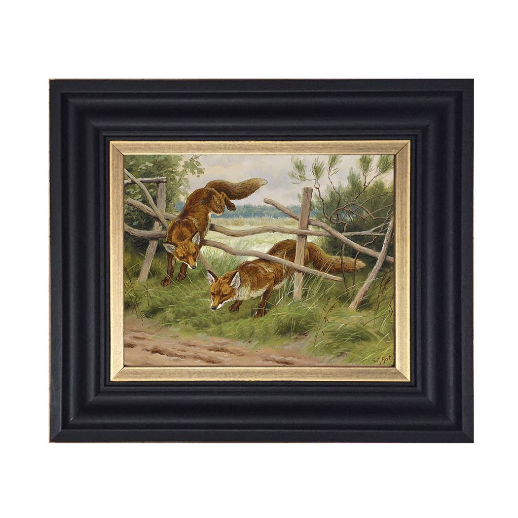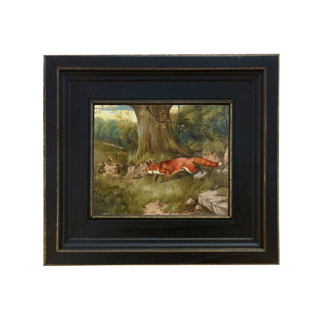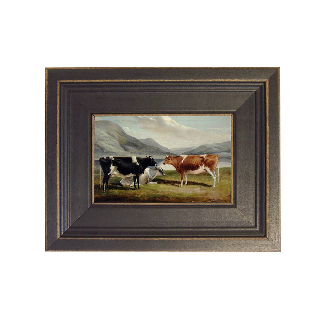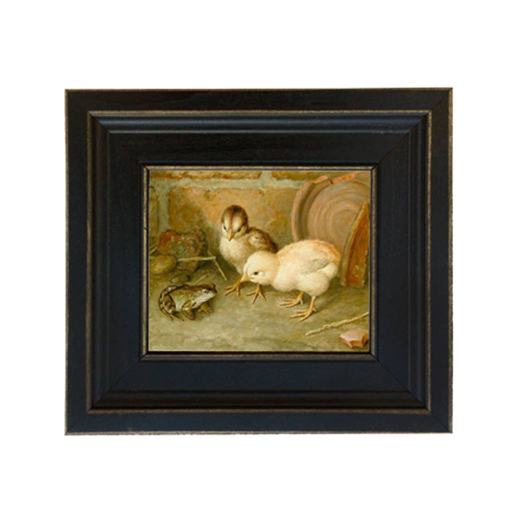 Accurately reproduced from the original work, this antiqued, Early American oil painting reproduction on canvas is lacquered and mounted on a board and framed in the proper period, black distressed-looking frame constructed of solid bass or poplar wood. The back is finished with 100% recycled craft paper and a saw tooth hanger. Made in USA. - Painting: 5" x 6" - Finished frame size: 8-1/2" x 9-1/2" - Frame width: 2" - Frame thickness: 3/4"