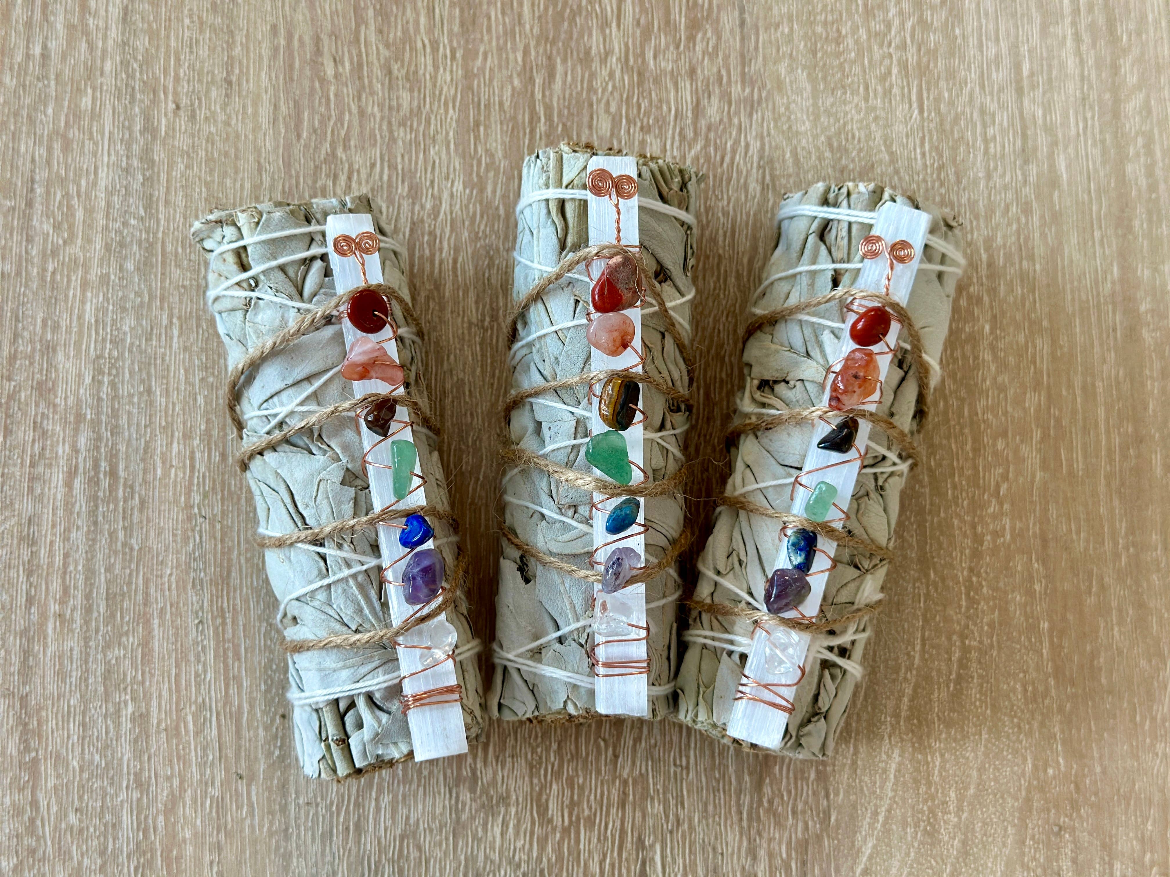 The Sage & Palo Santo bundle comes with a beautiful crystal. Easy for summer farmer's markets!