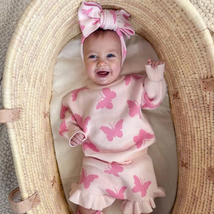Soft, cozy, and full of charm, this butterfly knit sweater is made to wrap your little one in comfort while adding the sweetest touch of whimsy. Crafted from a gentle, breathable knit, it feels soft against delicate skin and offers just the right amount of warmth for everyday wear. The playful butterfly pattern gives this piece a timeless, storybook feel, while the relaxed fit allows for easy layering and plenty of movement. Finished with ribbed cuffs and neckline for a cozy, polished look, this sweater pairs beautifully with the matching butterfly bloomers or can be styled on its own with leggings or tights. A standout knit you’ll reach for again and again — perfect for everyday moments and special memories alike. Fit: True to size, if your child is between sizes we suggest sizing up for a more comfortable fit. Material: 100% Pure Cotton Care: Wash on gentle cycle with like colors, lay flat to dry--do not bleach, iron and machine dry Due to the nature of knitted items, please allow a variance of 0.3/0.6 in. for all items.