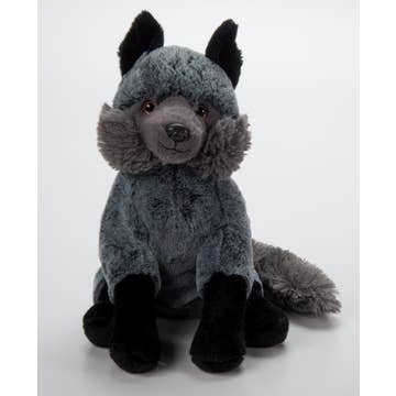 Night Dawnsing is our first alternate color edition of the original orange fox Dawnsing! She stands about 8 inches tall from top of head to her feet; her body is about 18 inches long, including her very robust, bushy tail. She is sewn from soft minky fabric and her face is embroidered to even include two little teeth! All four paws have embroidered paw pads, and her neck, ears, and tail tip are sewn with a very fine faux fur. She makes the perfect gift for Floral Frolic fans, as well as any fox lovers in your life! Night Dawnsing is dark plum and black with a fluffy white tail tip! She has light purple fabric in her ears, stars embroidered on the back of her ears and side, and lavender paw pads. She's a perfect match for purple star Queenie!