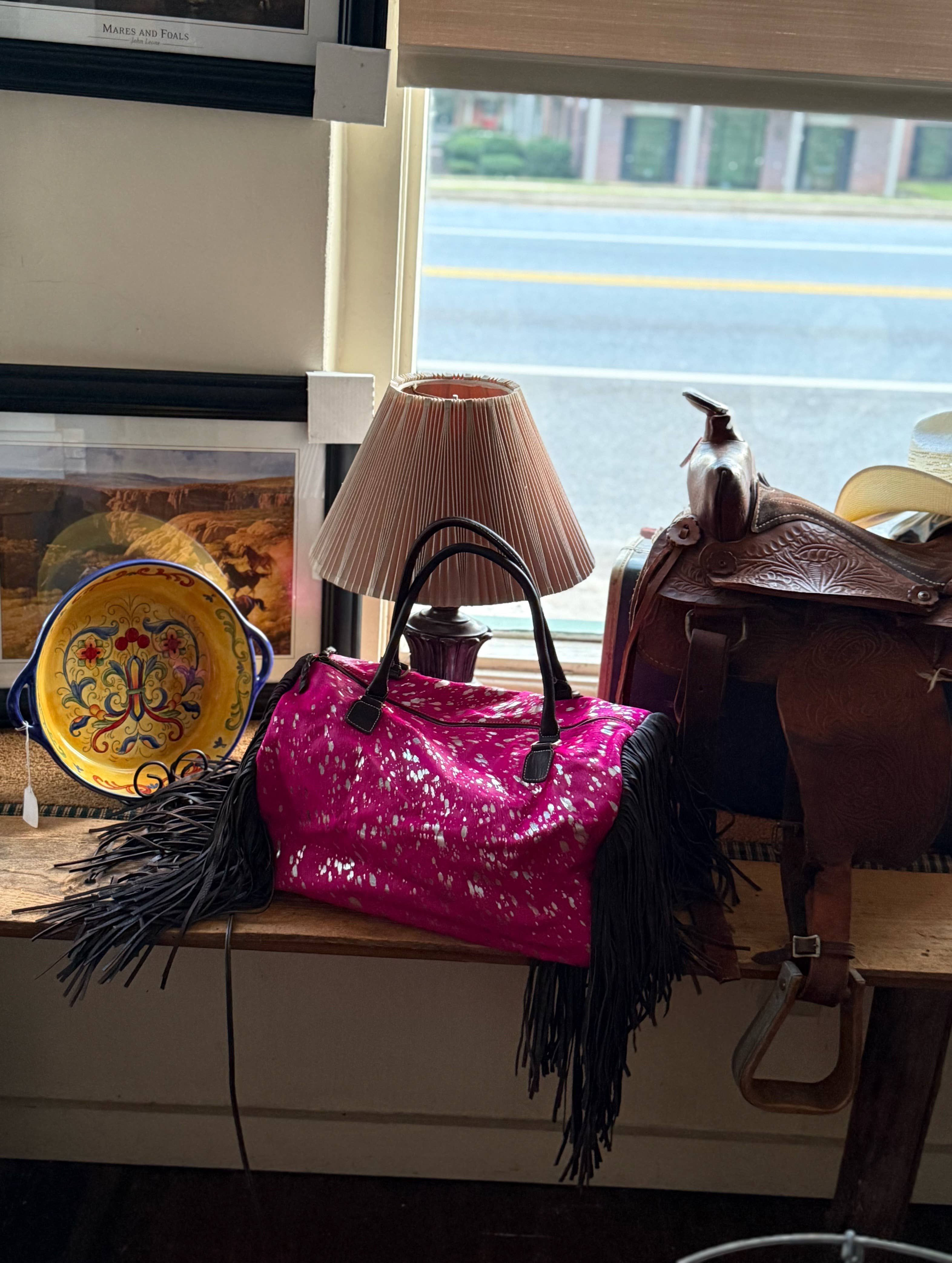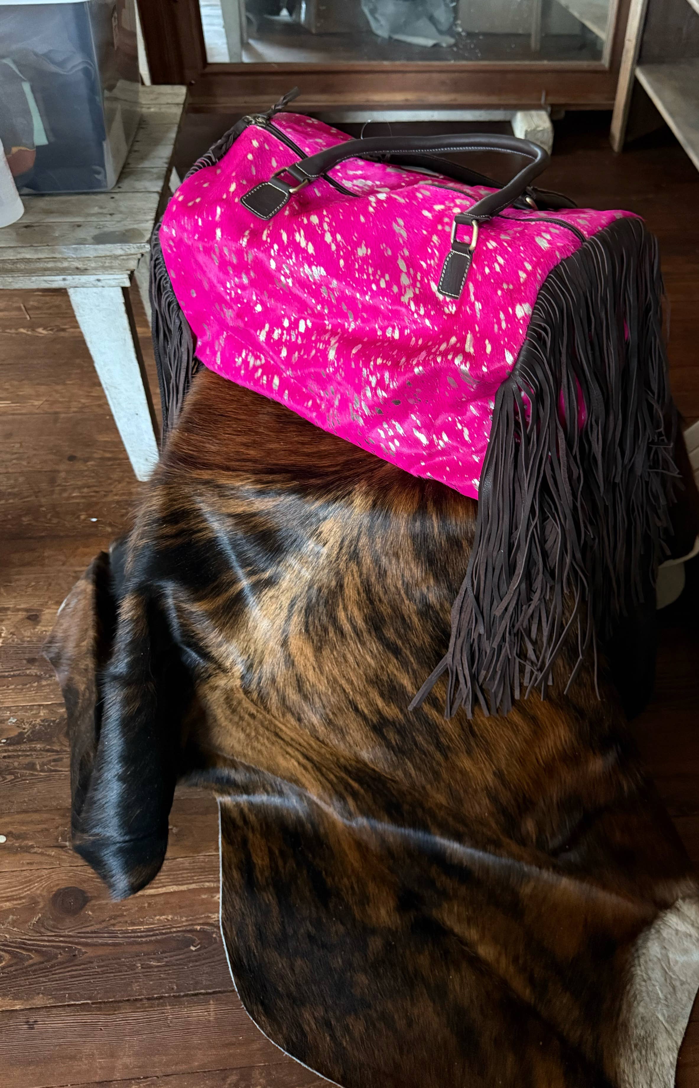This duffle is gorgeous! Can be used in so many ways: Diaper bag Tote travel duffle bag Weekender Purse Gym bag Work bag Genuine cowhide and leather Hair on Cowhide on the front, back, sides and bottom fringe in the sides Zipper closure hand tooled adjustable strap Removable Strap to carry on your shoulder or crossbody 2 open pockets inside Zippered pocket inside 18” x 12” x 12” Choose your color and we will send you a bag from that group. Bag will have similar pattern and colors but please remember with genuine cowhide no 2 bags will ever be the same. Makes a great gift! Model in pictures 5’4, size 2
