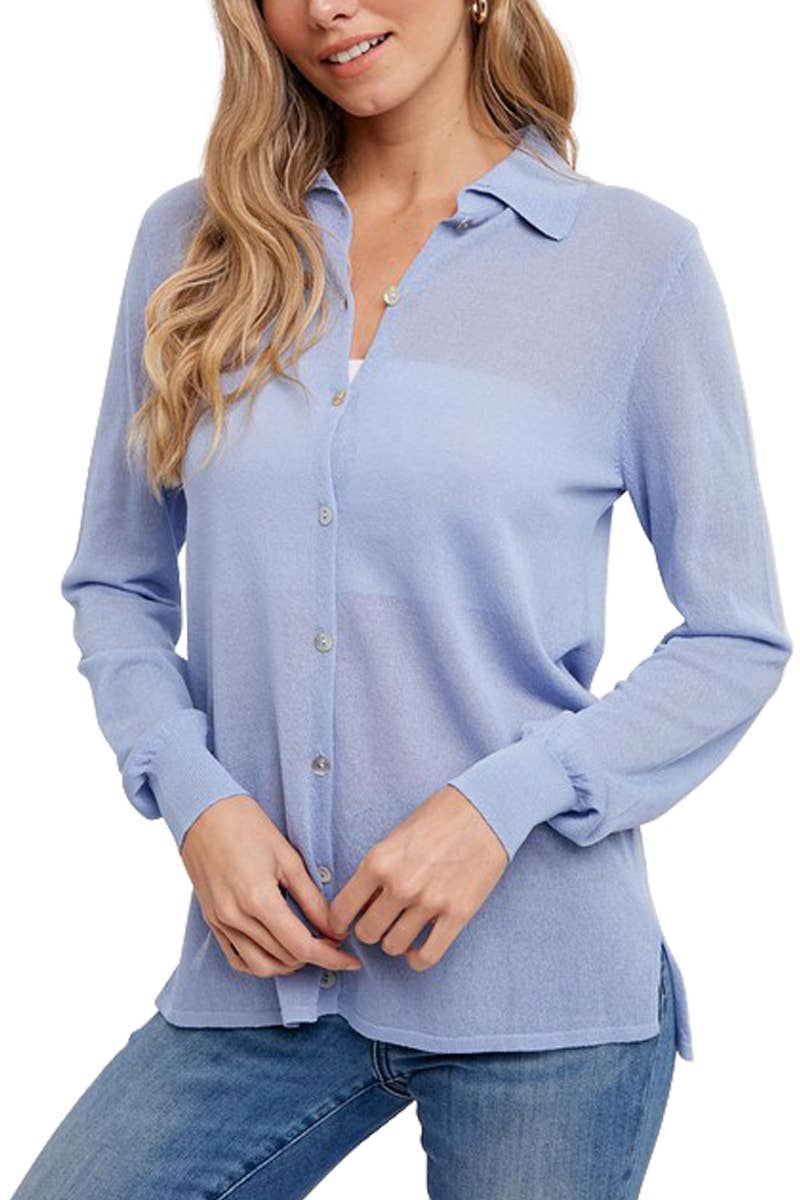 ​Lightweight knit shirt top featuring a button-down front with basic collar, long sleeves, side slits, relaxed fit. -Model is 5'9" and wearing a Small