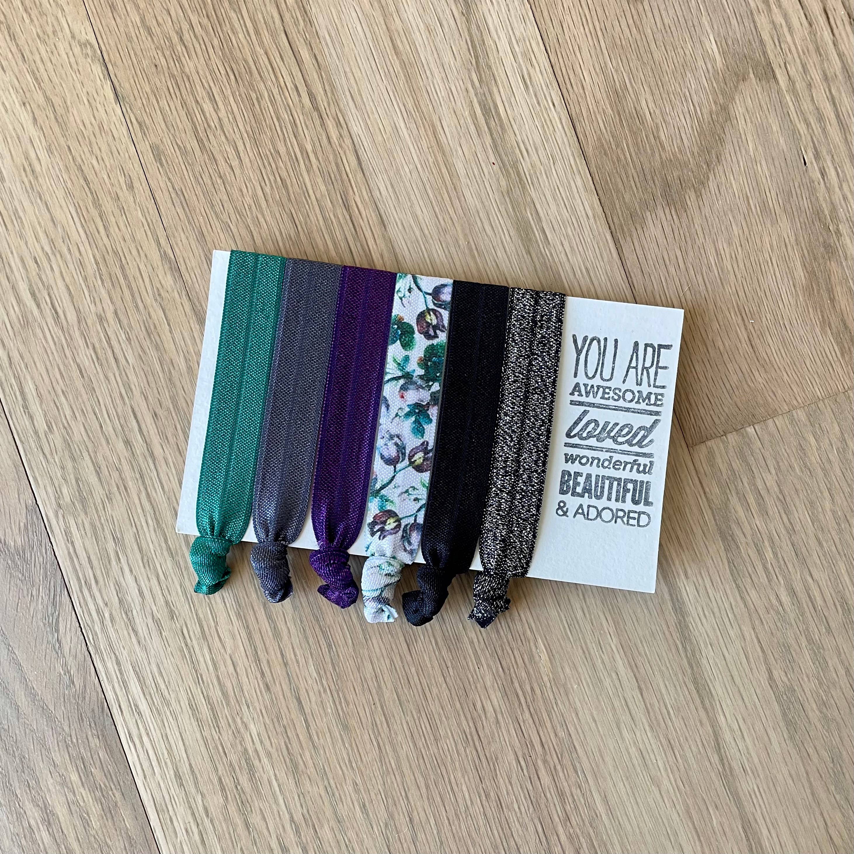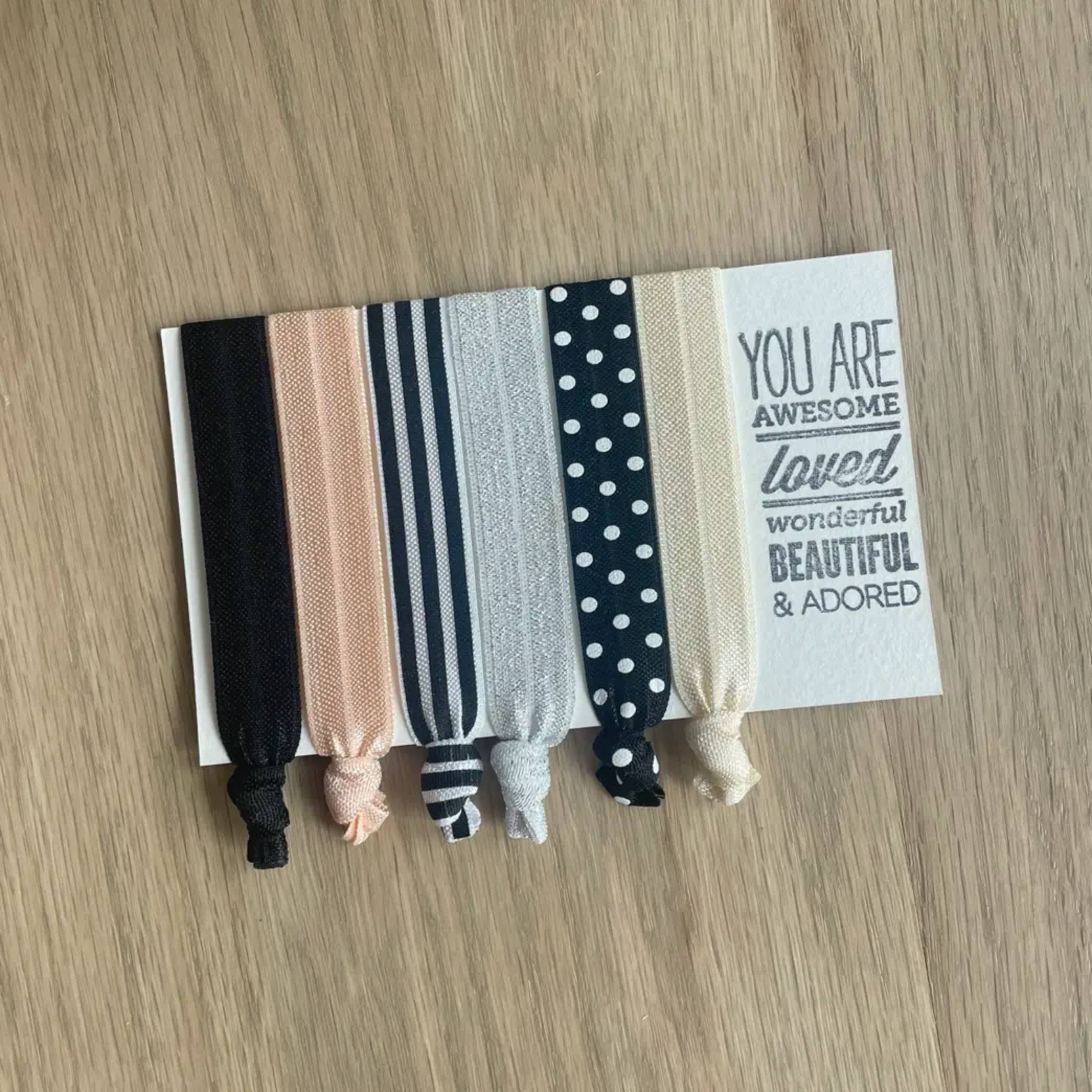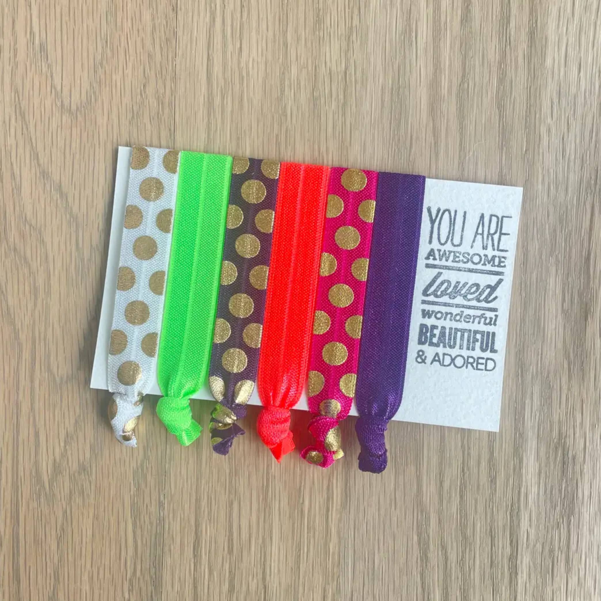 Our hair ties are made from super soft elastic, making them gentle on your hair. While not holding up that luscious ponytail they make great bracelets, so you're never without one! Each set of 6 comes packaged on a card complete with words of encouragement, these hair tie cards make fantastic gifts, sure to put a smile on her face! Each card is wrapped in a crystal clear envelope.