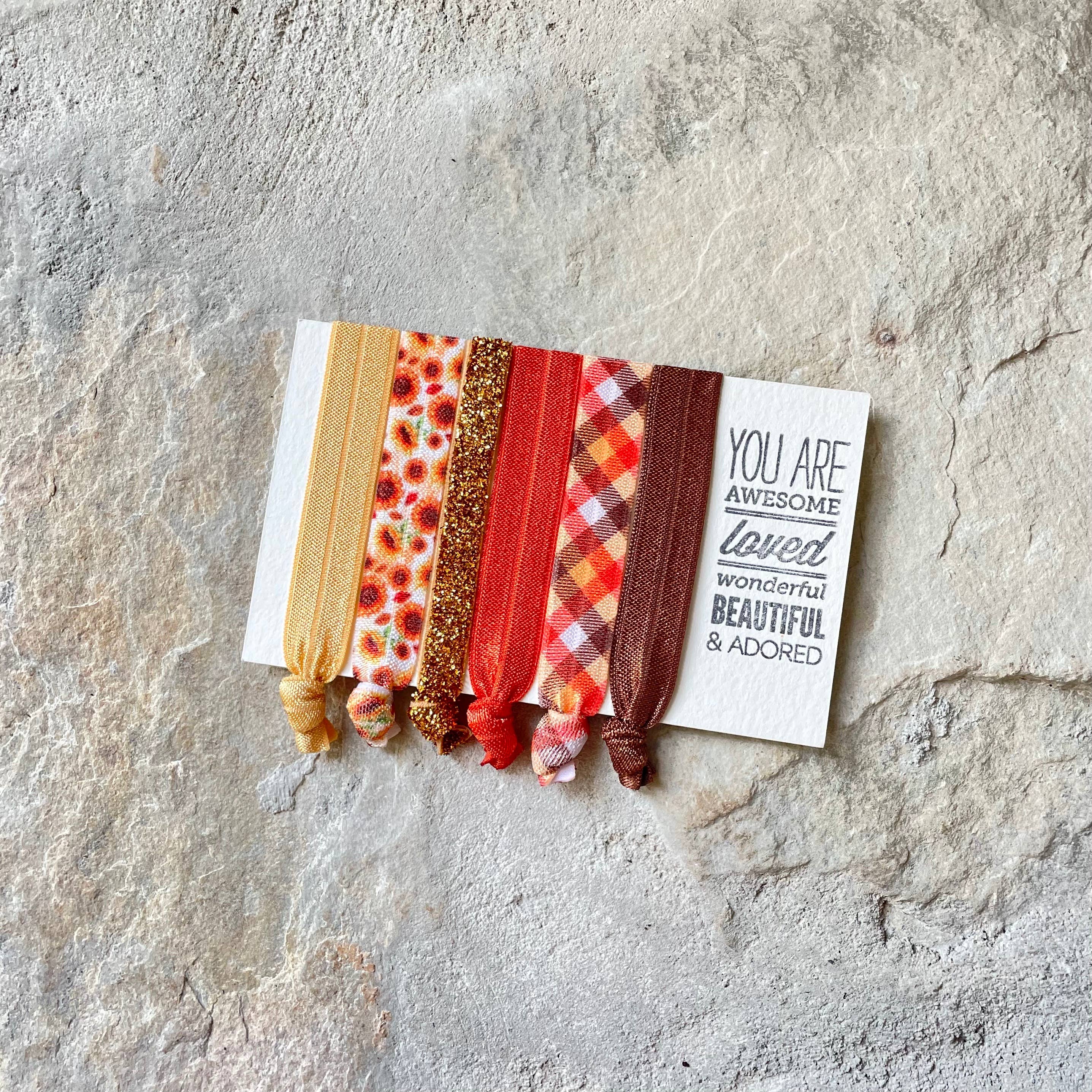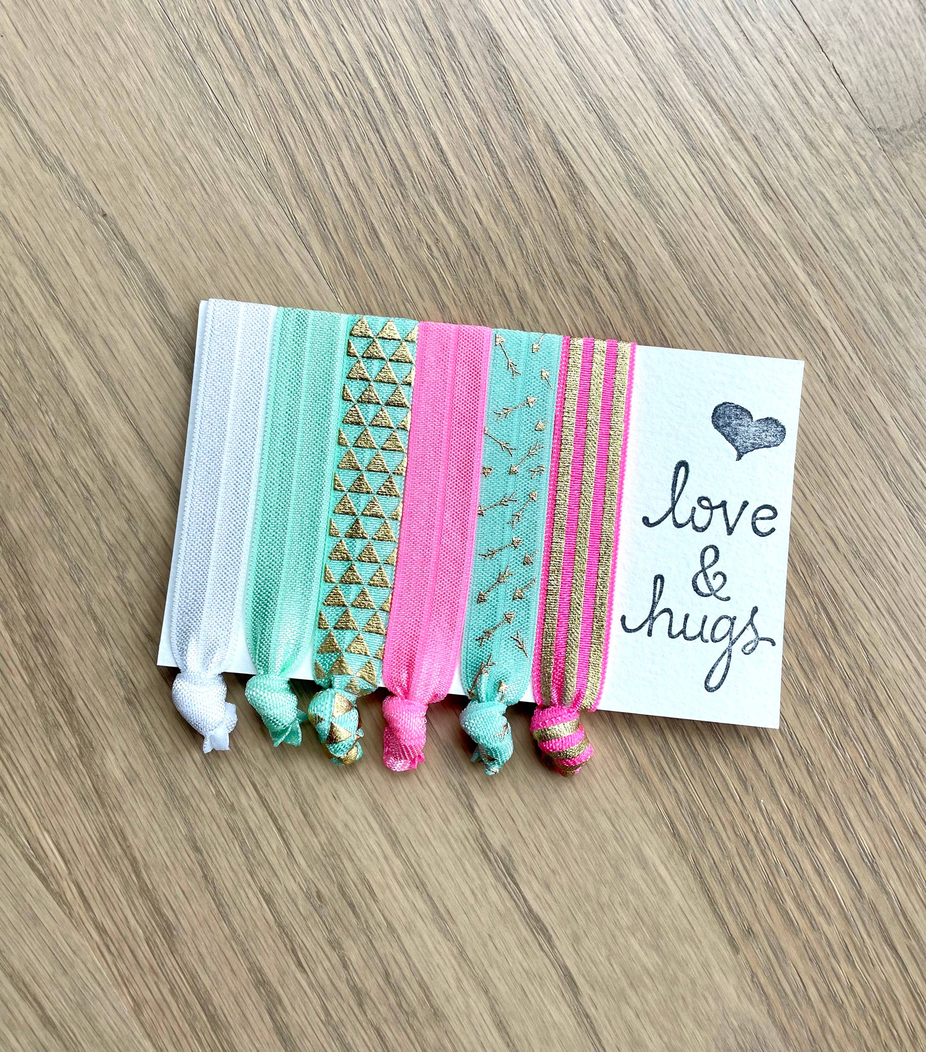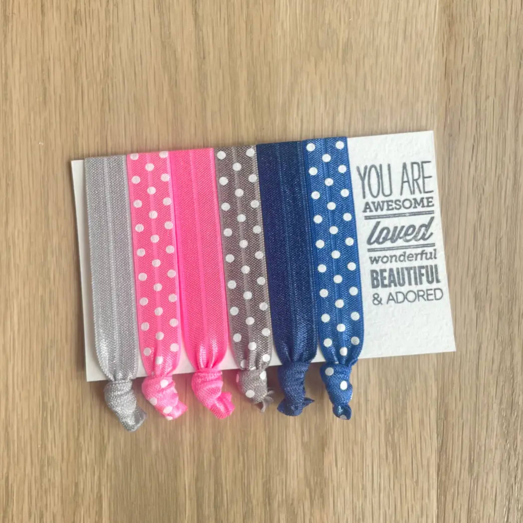 Our hair ties are made from super soft elastic, making them gentle on your hair. While not holding up that luscious ponytail they make great bracelets, so you're never without one! Each set of 6 comes packaged on a card complete with words of encouragement, these hair tie cards make fantastic gifts, sure to put a smile on her face! Each card is wrapped in a crystal clear envelope.