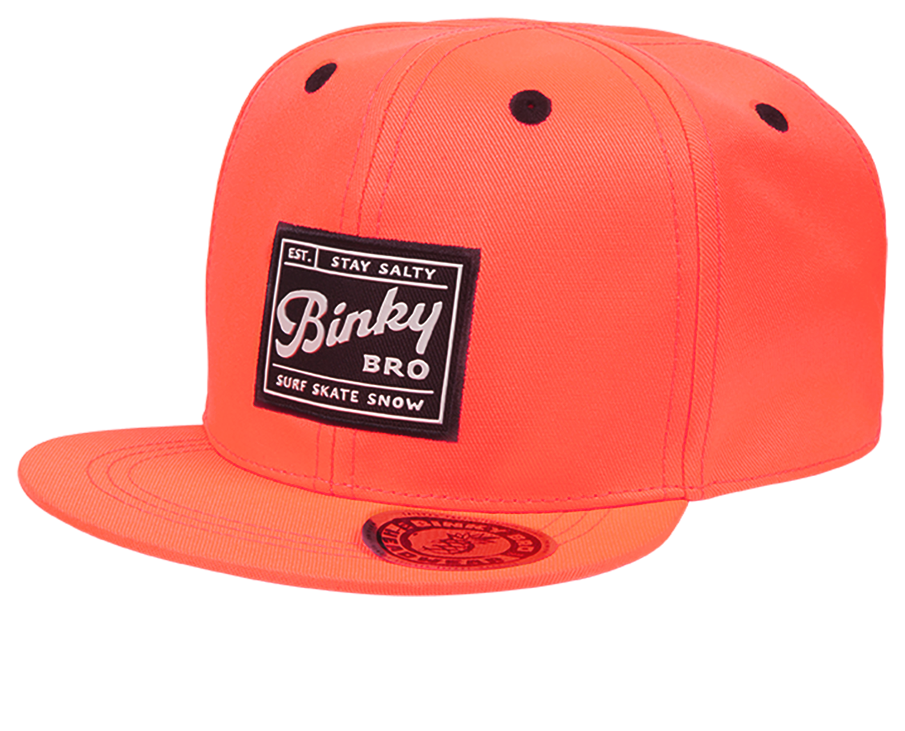 The Tourmaline infant/baby, toddler, youth snapback hat has neon yellow paneling, an embossed BinkyBro front patch, with black eyelets, a black snap, with a black under--brim.