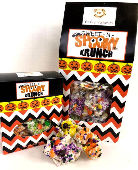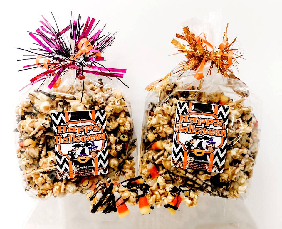 Our delicious caramel and vanilla popcorn mix are in this cute and festive Halloween Popcorn bag!