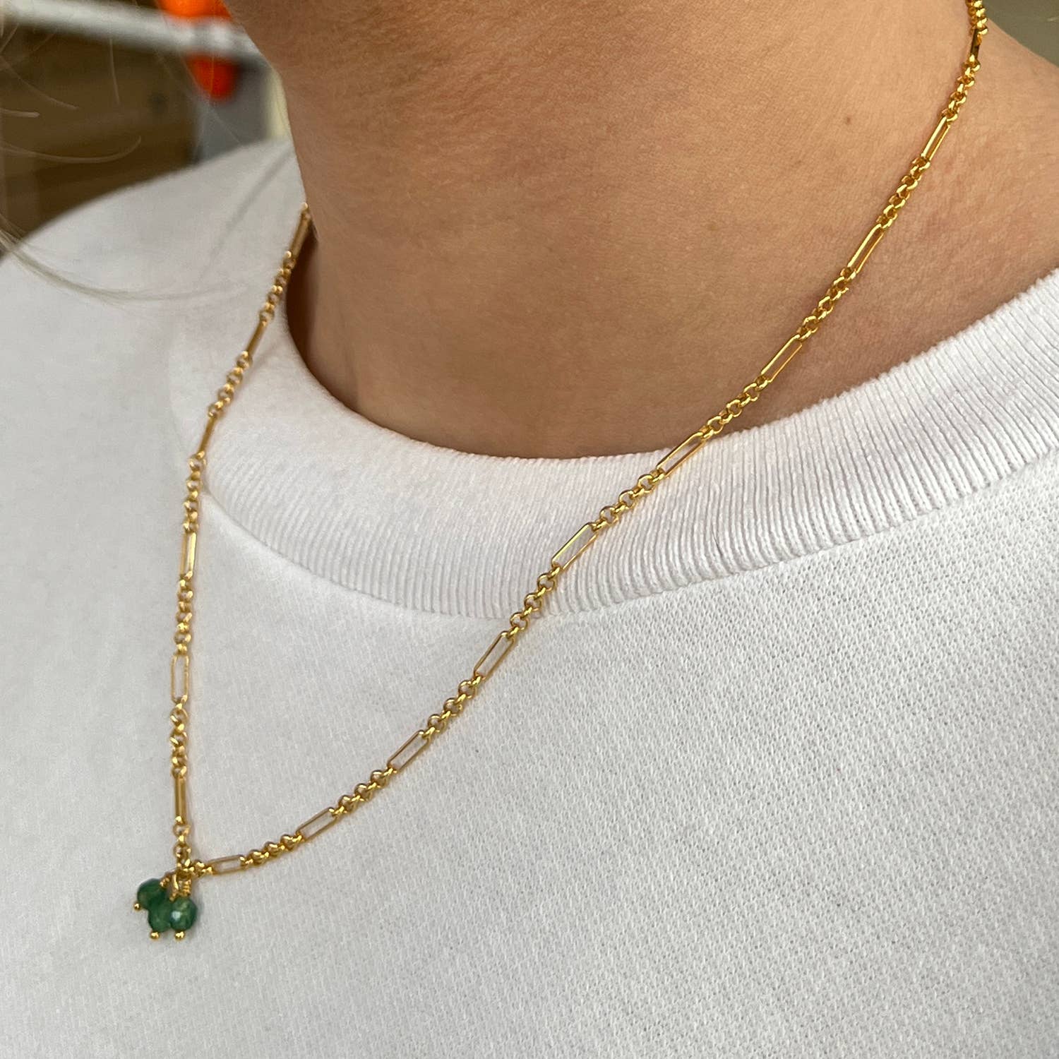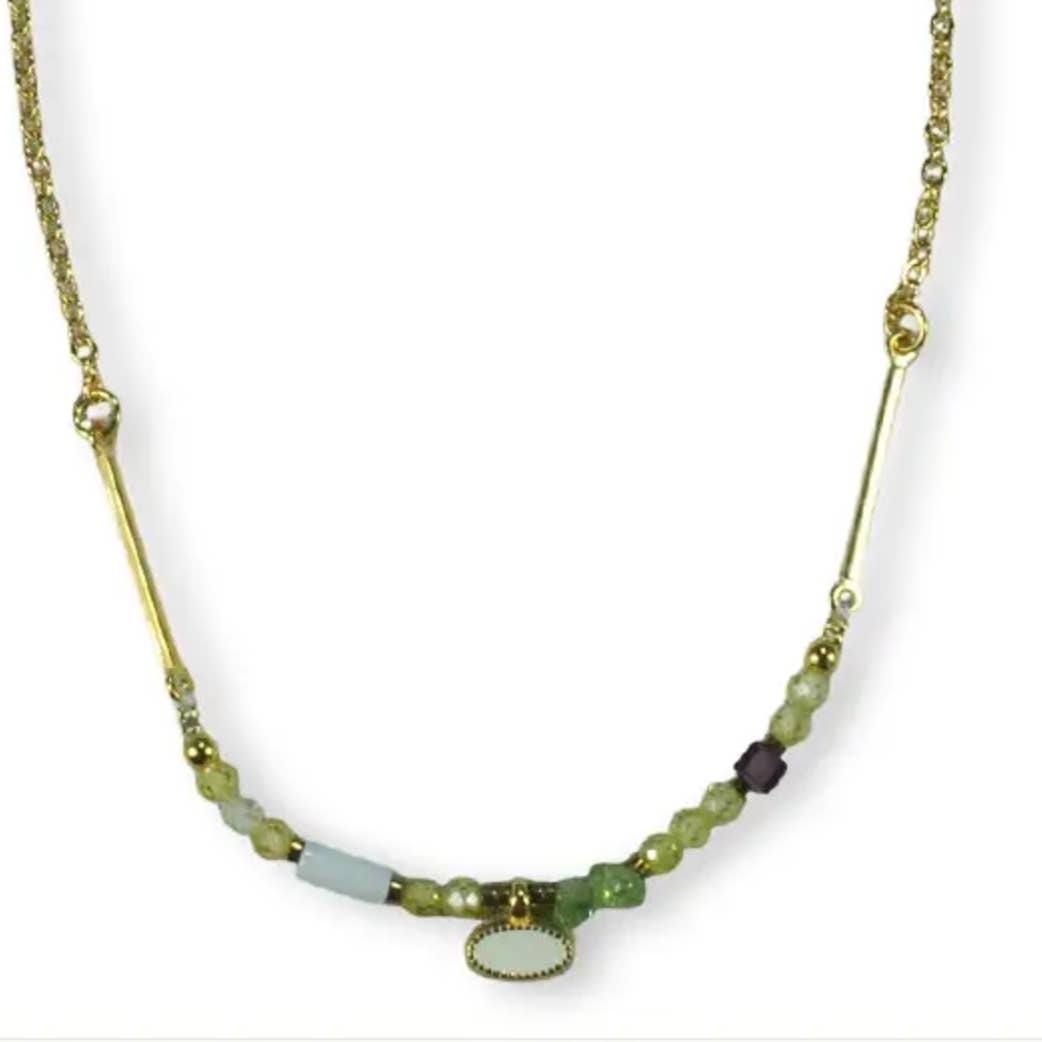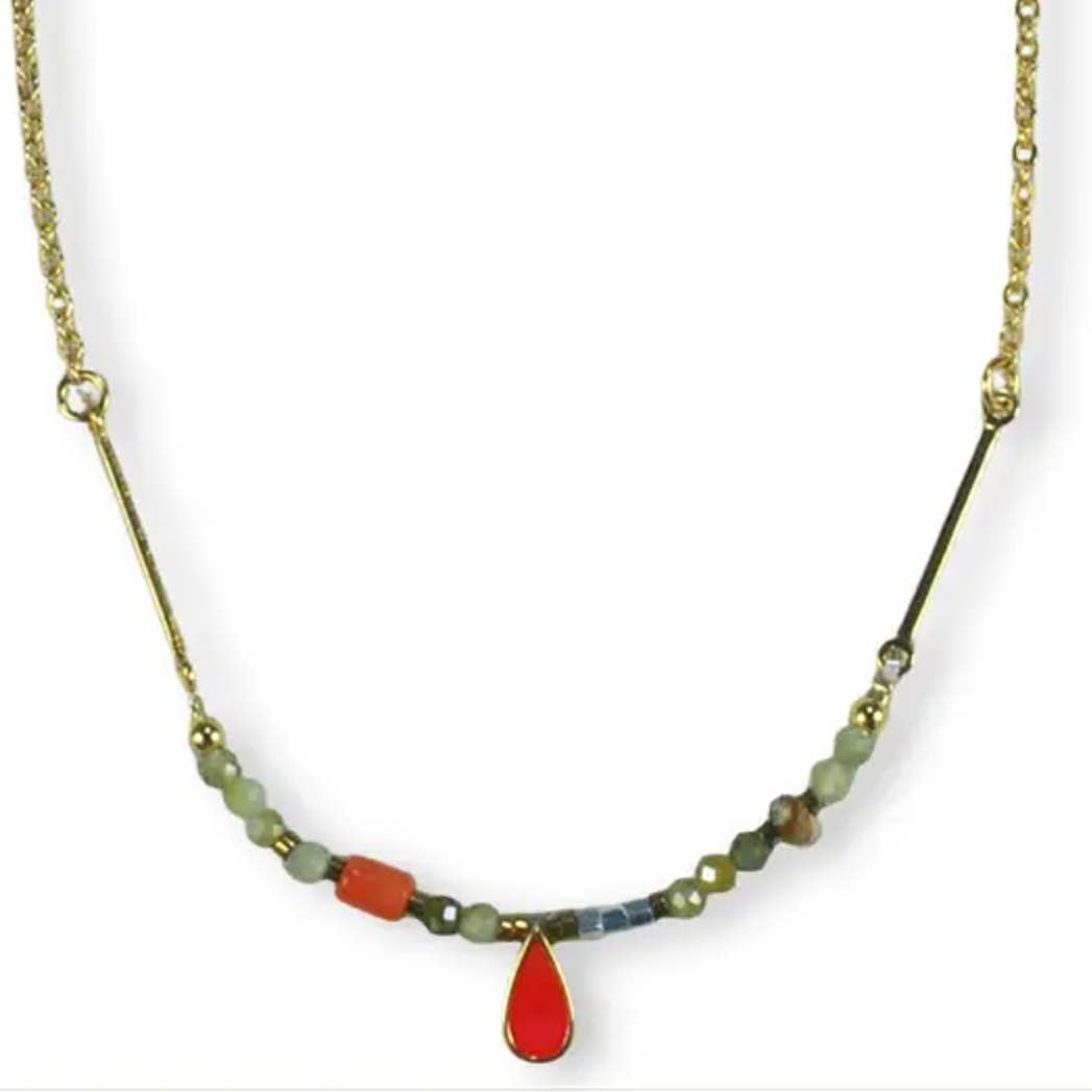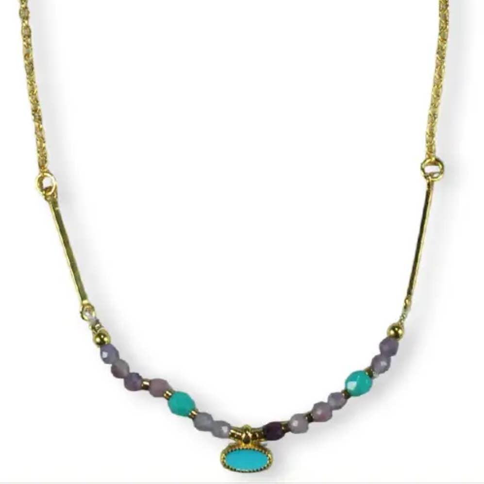 This fine necklace features an oval enamel pendant with a small semi-precious stone underneath. Minimalistic, feminine, and perfect to wear solo or to combine. Material is stainless steel and gold-plated. Length is ± 45cm.