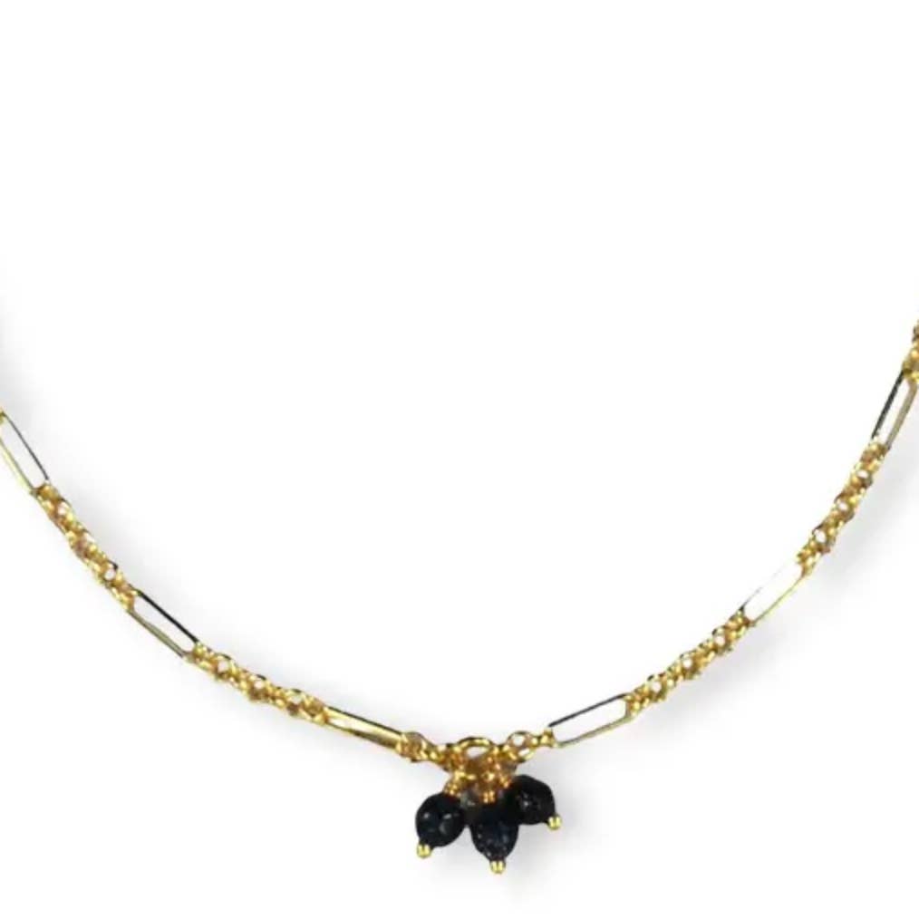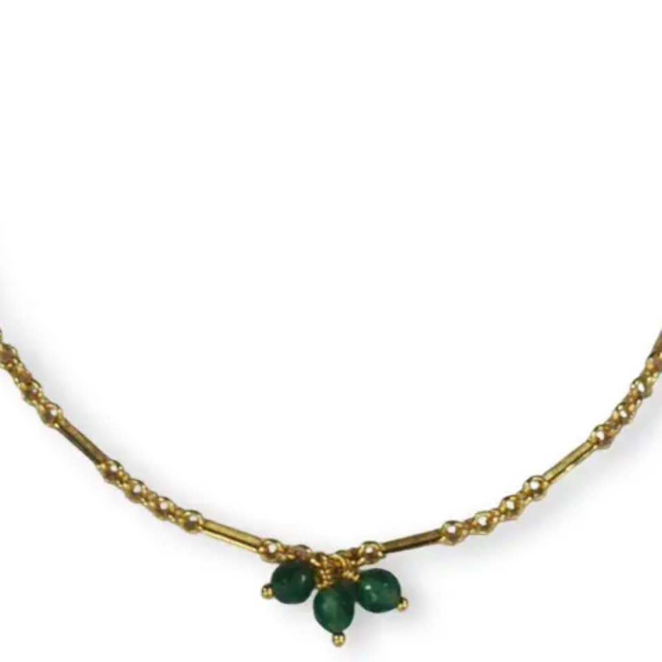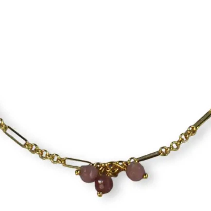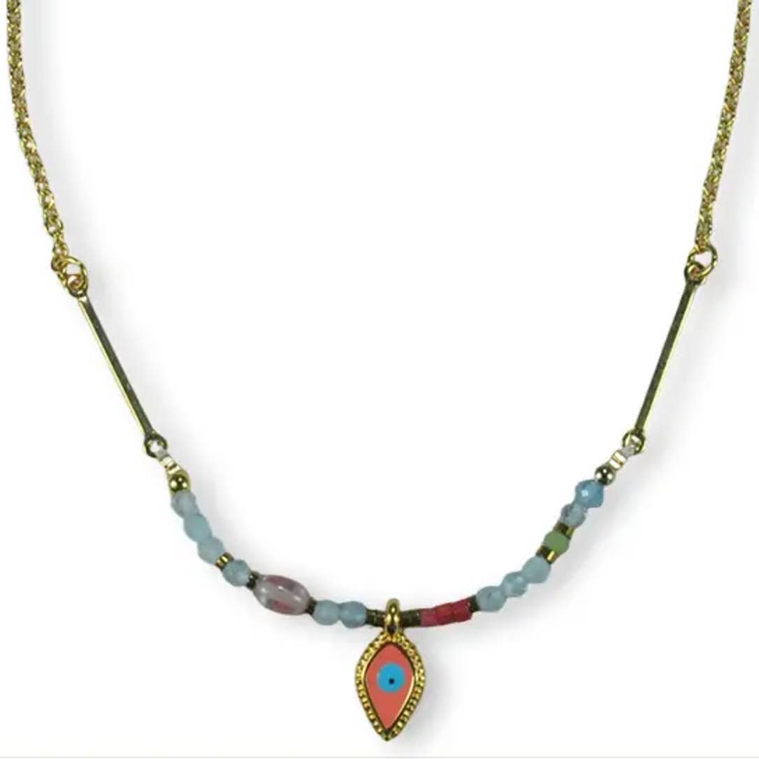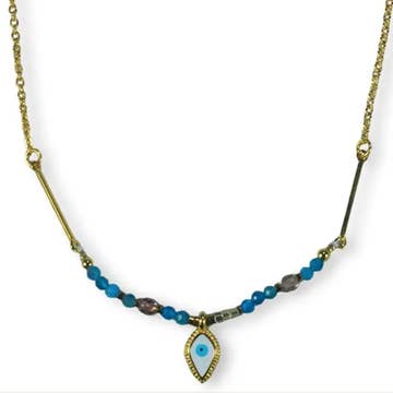 This fine necklace features an oval enamel pendant with a small semi-precious stone underneath. Minimalistic, feminine, and perfect to wear solo or to combine. Material is stainless steel and gold-plated. Length is ± 45cm.