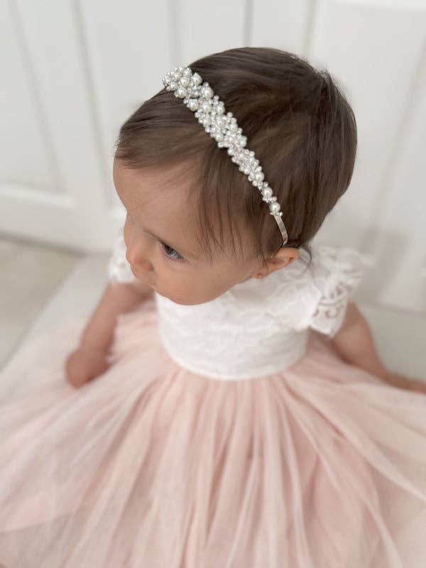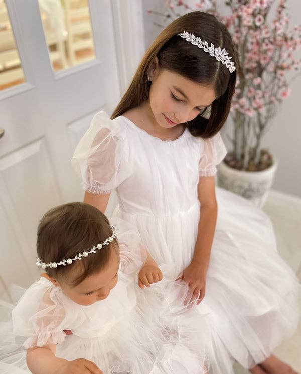 Hailey Girls White Long Sleeve Dress – Timeless Elegance for Communion & Special Occasions The Hailey Girls White Long Sleeve Dress is a beautiful, graceful choice for Holy Communions, Confirmations, weddings, and flower girls. Crafted from premium white French chiffon with delicate floral lace, it’s designed for true elegance and comfort all day. With a flattering full-length A-line silhouette and a striking V-back with zipper closure, the skirt falls and moves beautifully for pictures, ceremonies, and celebrations. Fully lined in 100% cotton, your girl will feel comfortable and confident from start to finish. Style with a gorgeous flower crown or sparkling headpiece for a polished finish. Our model pairs this dress with the Evelyn Silver Pearl headpiece. Flower crowns and accessories can be purchased separately. Key Features * Design: Full-length A-line silhouette with elegant long sleeves * V-Back: Sophisticated V-back with secure zipper closure * Fabric: Premium white French chiffon with floral lace detailing * Lining: Fully lined in 100% cotton for softness and breathability * Occasions: Perfect for First Communion, Confirmation, weddings, and flower girls Sizing Note This is the updated Hailey Dress with revised sizing in larger sizes. Please refer to our size guide for accurate measurements.