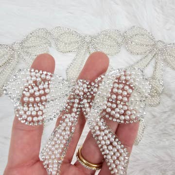 Wholesale Rhinestone Bow with Silver Outline and White Pearl Iron-on Patch