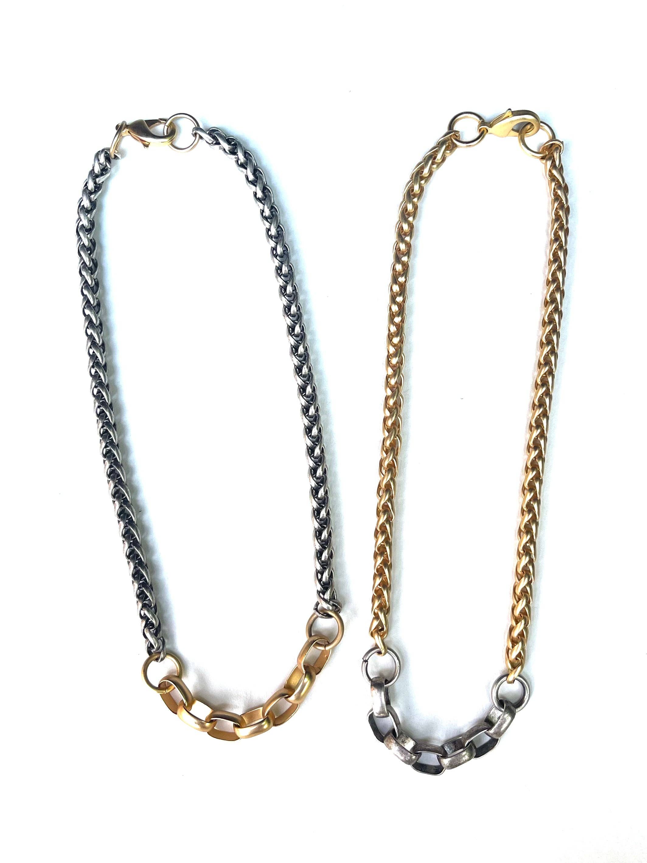 Necklace with matter gold and antique silver chains layered;
