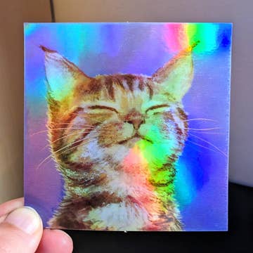 A cute little cat face outlined in a dazzling shiny rainbow! This special space kitty has a red galaxy pattern and bright golden yellow eyes. STC 025 This high-quality holographic-outlined vinyl sticker is vibrant, durable, & weatherproof. Suitable for many smooth surface applications like laptops, phone cases, water bottles, helmets, car windows, and more.