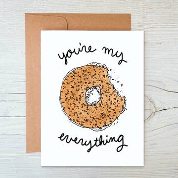 Celebrate Christmas, Hanukkah, the New Year and special occasions all year round with this fully loaded everything bagel card. Printed on 100% recycled paper and paired with a coordinating envelope. Blank inside and sealed in a protective cellophane sleeve. Size A2 (4.25" x 5.5"). Card reads "Happy Everything" and features an illustrated everything bagel topped with lox and cream cheese, surrounded by confetti.