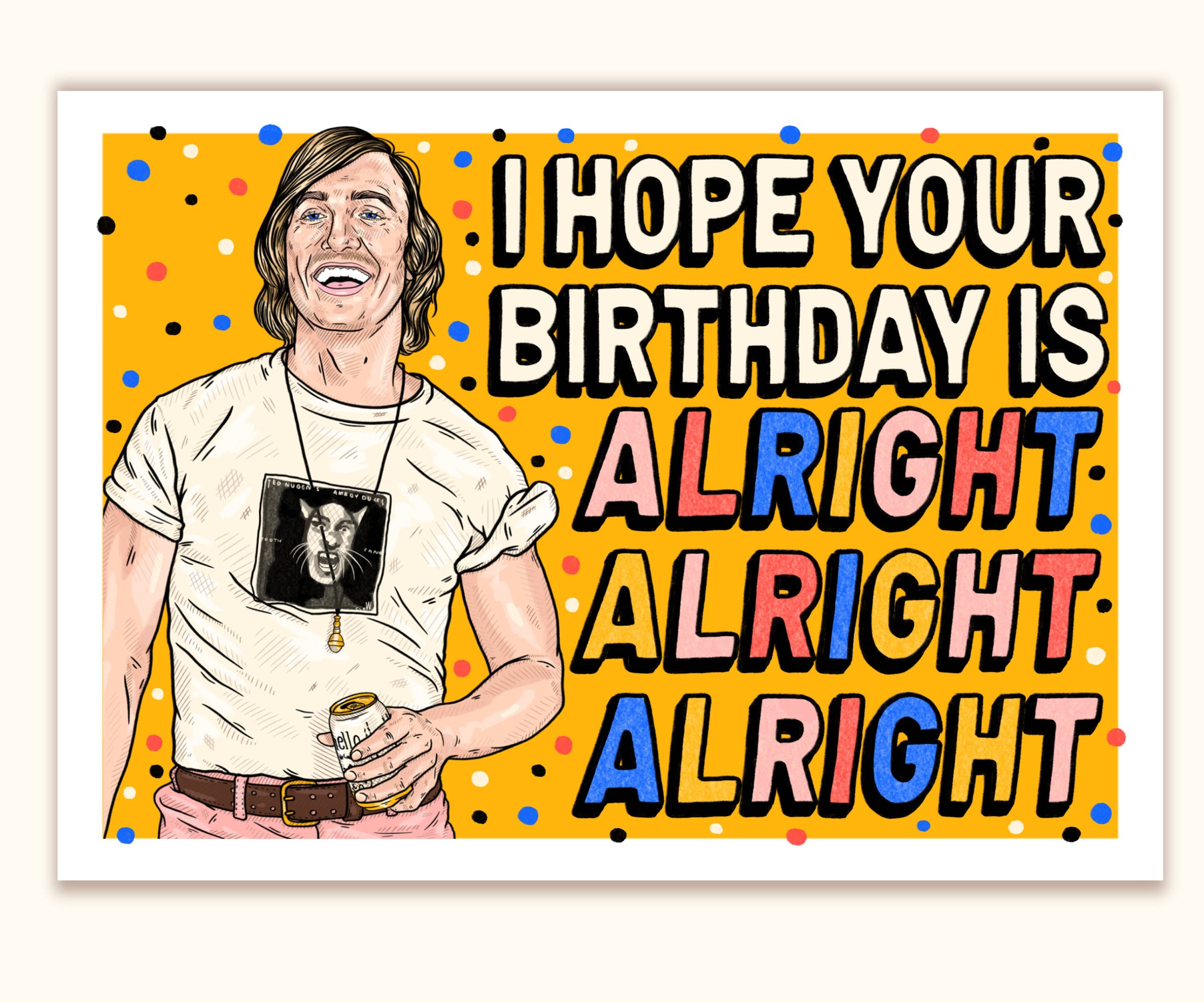 SKU: GCARD226 Made in United States Color: Multi-Colored and White Finish: Matte and Textured Is Set: Individual Theme: Pop Culture Tone: Funny Weight: 11.34 g (0.4 oz) Dimensions: 14 x 10.8 cm (5.5 x 4.3 in)