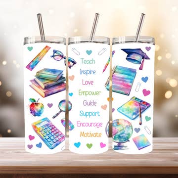Can be left as plain pencil, or add name or name and quote. Add your teacher's name to make a great personalized gift! 20oz skinny tumbler. Double walled insulated stainless steel tumbler keeps drinks cold all day and does NOT sweat. Will also work for hot drinks. Comes individually boxed with slide top lid, plastic straw and care card. Can be personalized upon request. DISCLAIMER: This is a sublimation printed design, There is NO REAL GLITTER!! Design image may look slightly different than mock up or examples due to the sublimation process. Please be advised not all designs are seamless - and flat colors will likely show more seam line (as opposed to busier designs/background.)
