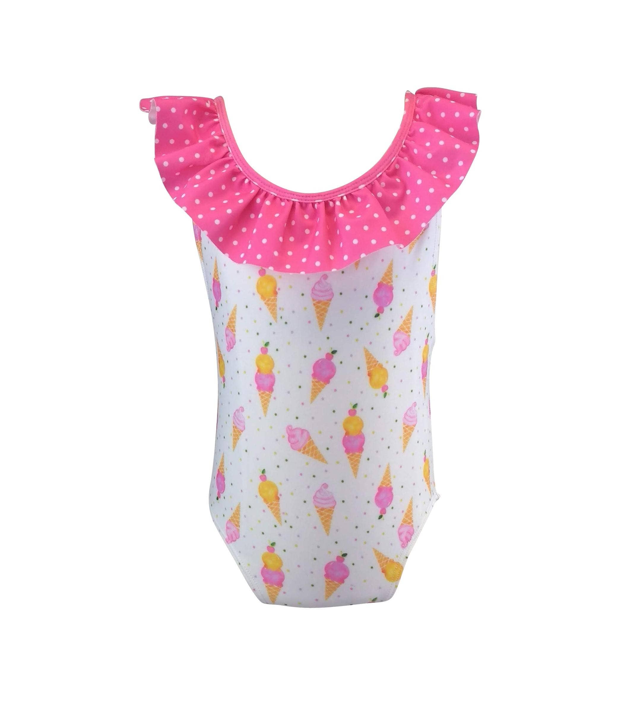 Freshen up her swimwear wardrobe with the Ice Cream Print Swimsuit. The one-piece swimsuit is designed with a white backdrop decorated with a colorful ice cream print, which lends a cute look. Bowknot along the waist adds a playful touch to her look. The pullover style allows for easy dressing. You can add beach slippers and a sun hat to sweeten up her swim-ready look. Size: 1-2T 2-3T 3-4T 4-5T 5-6T Material: 20% elastane and 80% polyamide Care: Machine wash Color: Light Blue, Multi